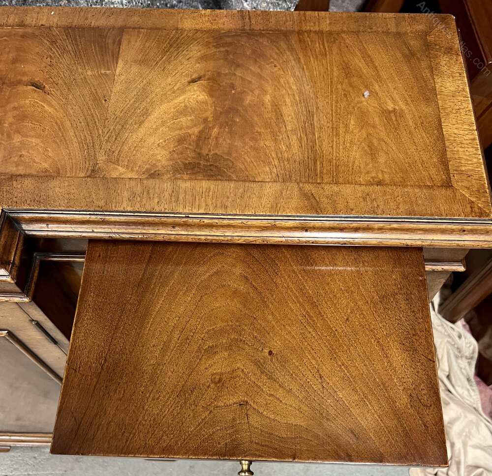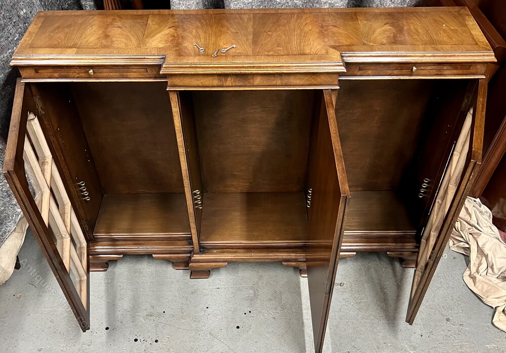 A good quality Queen Anne style dwarf walnut bookcase of breakfront form. The book matched walnut top having a cross banded and moulded edge above a beaded frieze which has 2 useful pull out book rest slides with brass pulls. The centre panelled door having applied cross grain mouldings within cross banded frames and flanked by astragal glazed doors with conforming mouldings and cross banding. Each section having 2 adjustable shelves and brass escutcheons, working locks and keys. The whole standing on ogee shaped bracket feet. An unusual bookcase in very good condition. Dimensions :- Height...37''/ 94cm. Width...51''/ 129.5cm. Max.Depth...12''/ 30.5cm. Shelf Depths ... 2 at 8.75''/ 22.5cm. 1 at 10.5''/ 26.5cm. Delivery by furniture carrier £75.