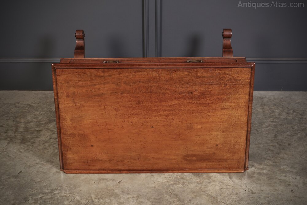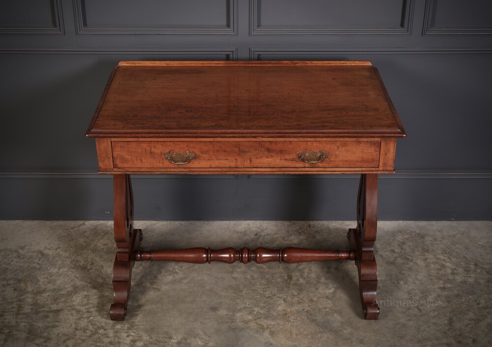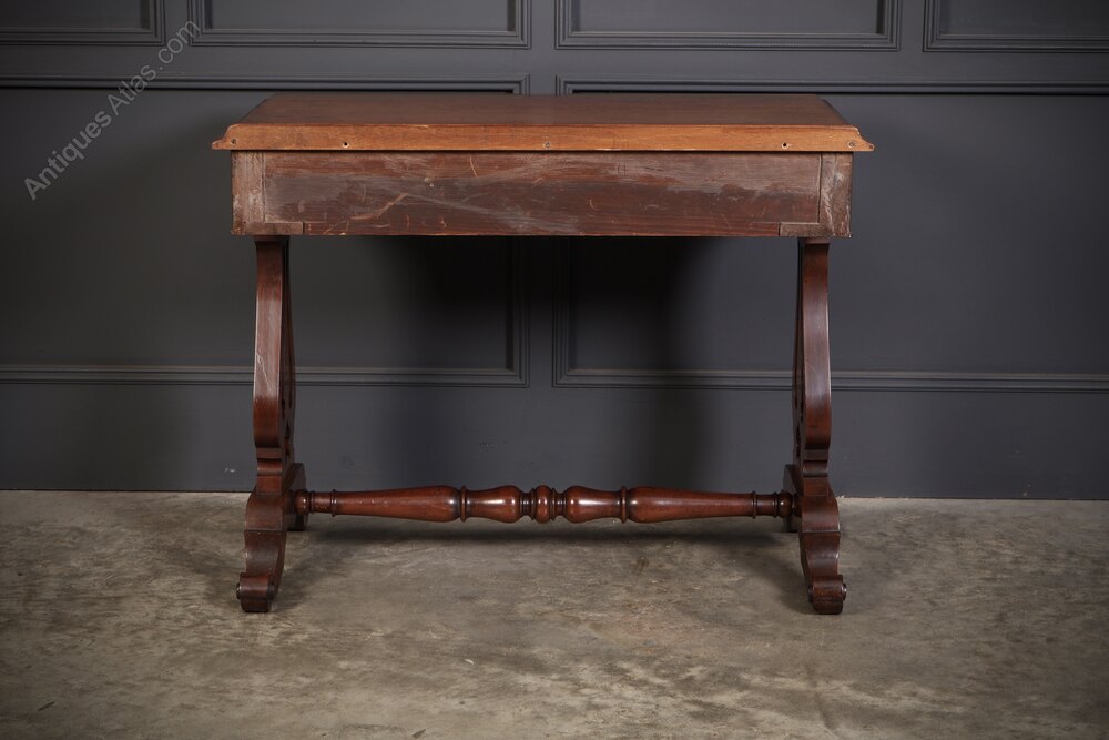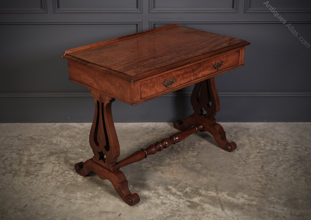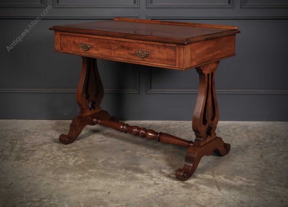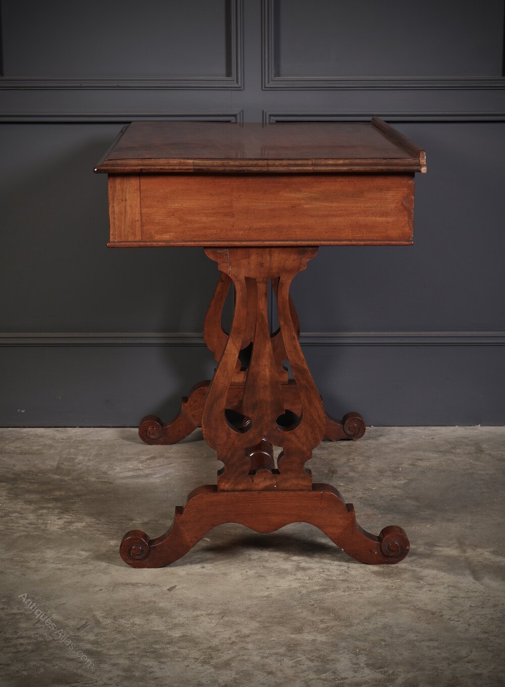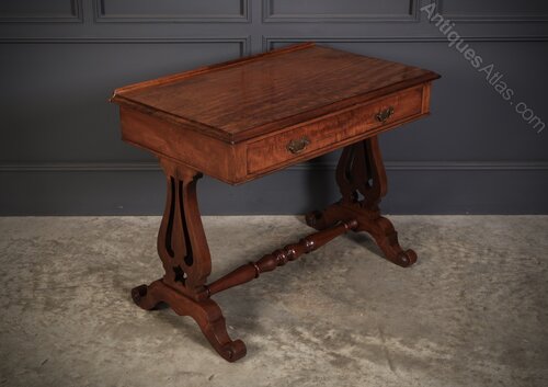Raised on lyre end supports with a turned stretcher and scroll feet.