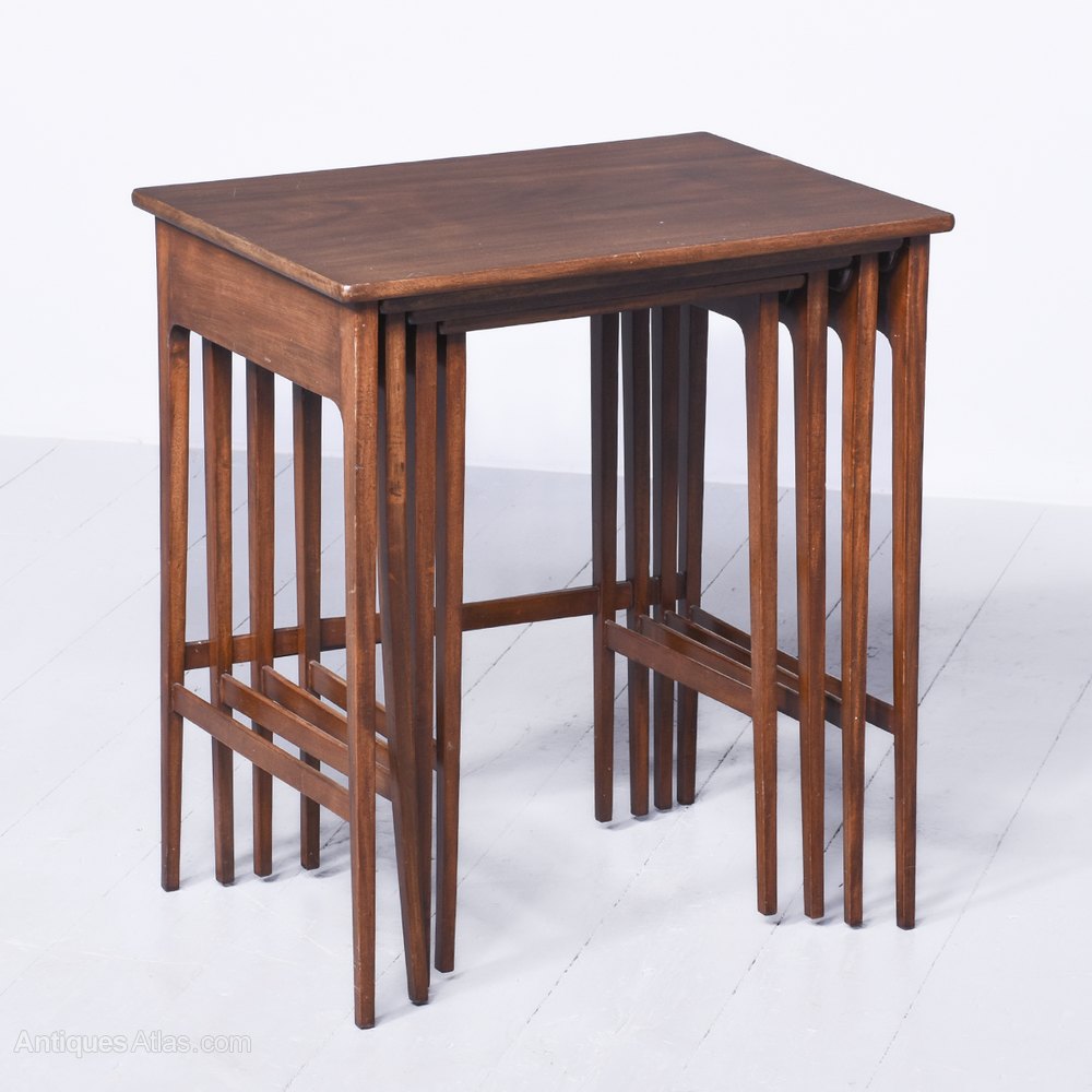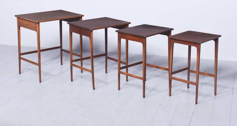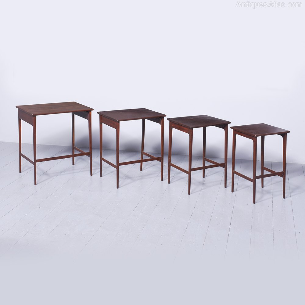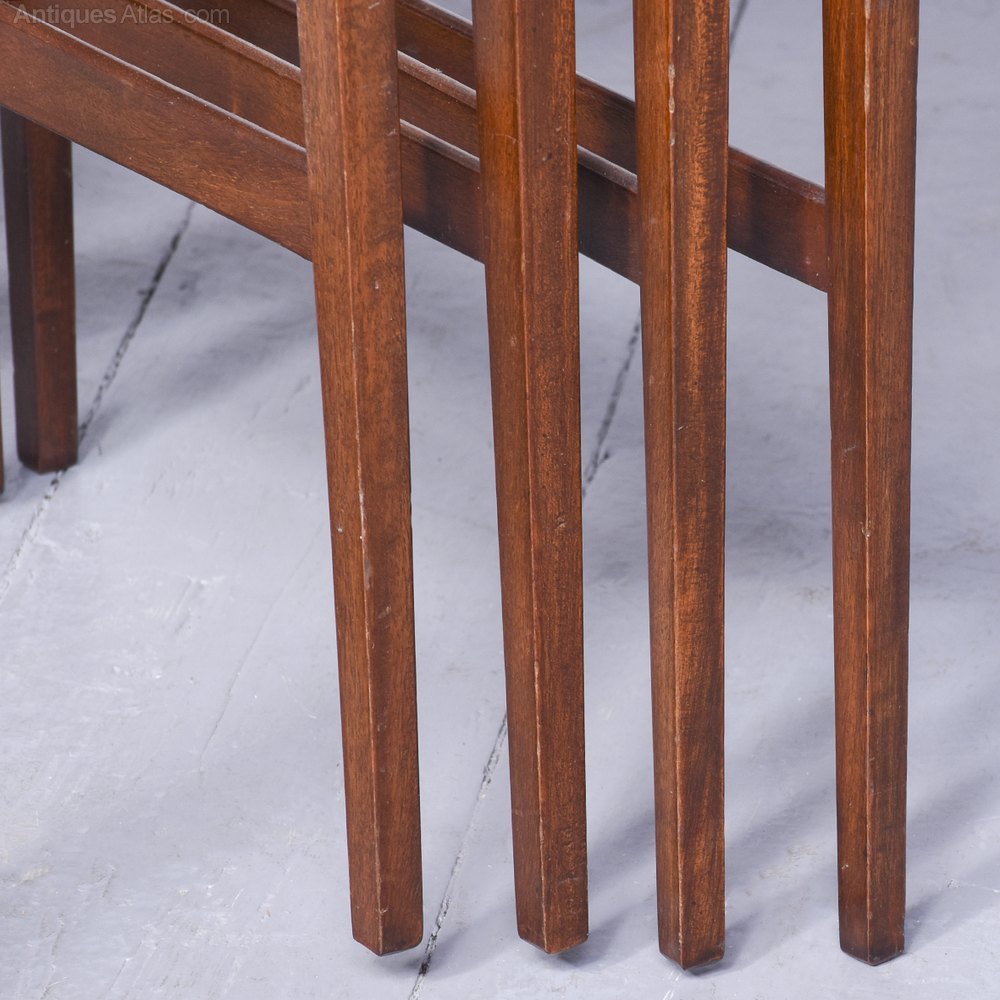 Circa 1920s. A neat sized quartetto of mahogany occasional antique tables. The rectangular tops with slightly rounded fore edge with the three smaller antique tables nesting neatly beneath the larger one. The tables stand on simple square tapering legs, braced by simple stretchers on three sides for stability.