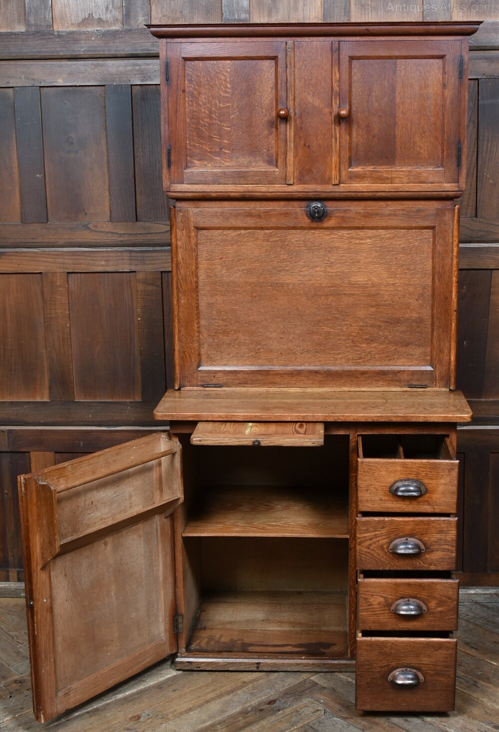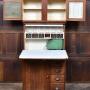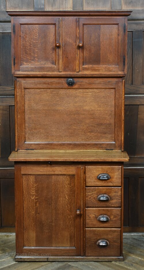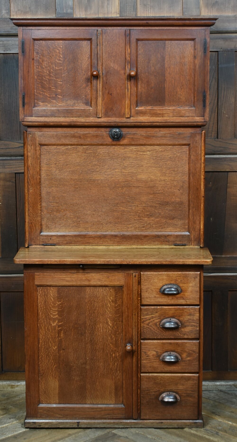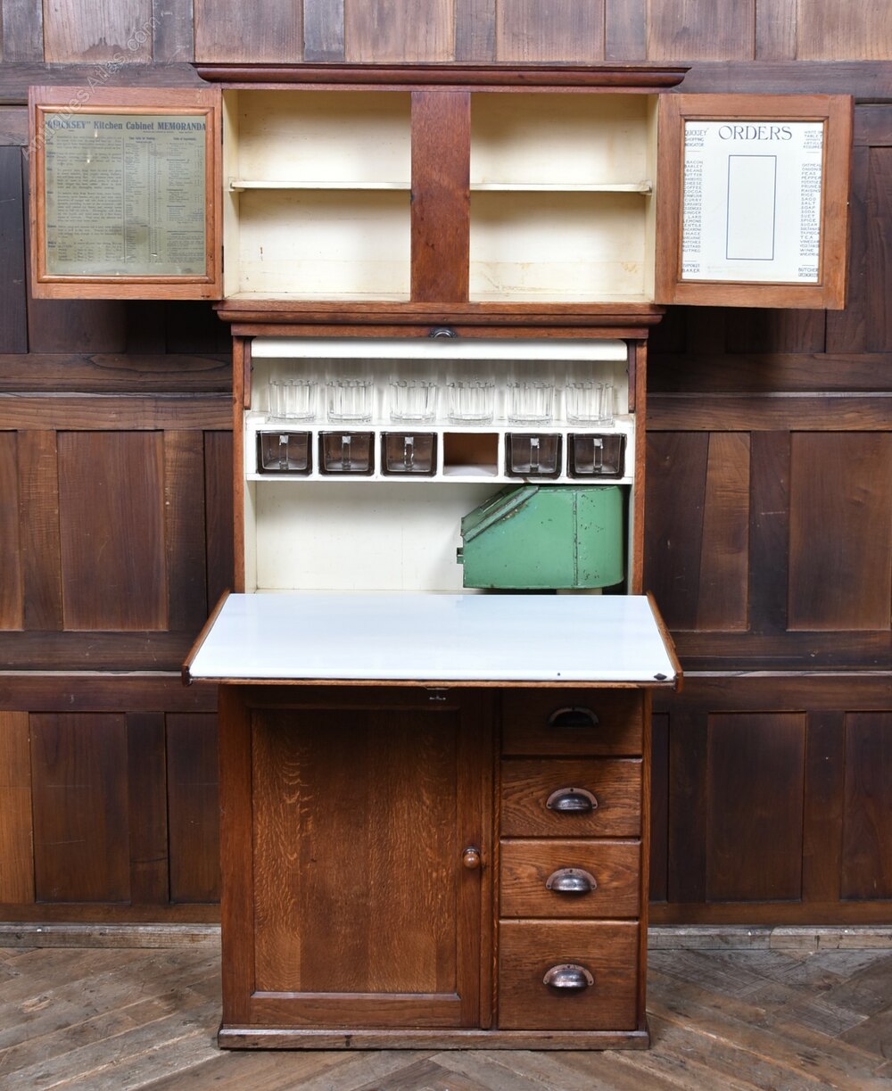 A rare “Quicksay” oak kitchen cabinet, complete with its original framed memoranda panel — a charming relic of post-war domestic ingenuity. The top section features two panelled doors with bun handles, opening to a shelved interior. Inside, a framed memoranda panel curates a set of practical notes, including cooking times, cleaning tips, and measurement conversions. Opposite sits the original “Quicksay” Shopping Indicator, framed and intact. The middle section comprises a panelled fall-front door that opens to a white-painted shelf with six compartments. Five original storage jars remain, with one missing. Above, six glasses are neatly housed, while below sits a metal-lidded compartment — ideal for storing dry goods such as flour, sugar, or pulses. The base reveals a concealed chopping board, a shelved cupboard with two towel rails mounted on the door, and four drawers fitted with classic cup-style drawer pulls. As with all antique furniture, there are imperfections, but this wonderfully preserved cupboard exudes post-war domestic efficiency. Its warm oak patina, period typography, and practical layout evoke the spirit of mid-century home life — making it a striking centrepiece for a vintage-inspired kitchen or pantry.