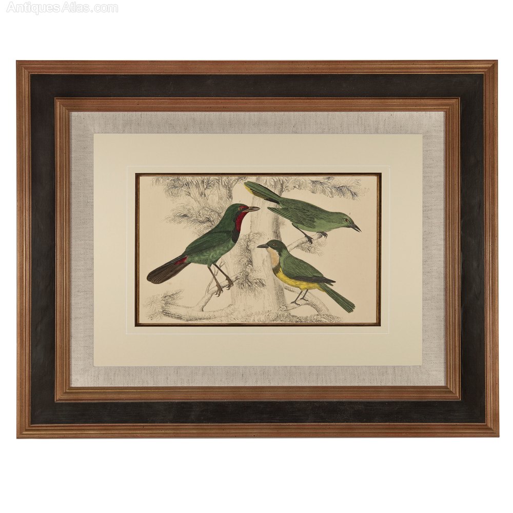 This very wonderfully observed and intensely (hand) coloured tropical birds plate was prepared for 'The History of the Earth and Animated Nature' by Oliver Goldsmith. Hand Produced in c1875. Its intricacy and the intensity of its hand painted and hand graduated colours (of which we count well more than a dozen, including half a dozen greens alone) are simply astonishing, it is a real and genuine work of art. As if the painstaking and intricate hand-colouring (achieved though hundreds of brush strokes) wasn't enough the main subject is set against an incredibly detailed etching of the native rainforest terrain (teaming with foliage and life everywhere) that is home for these birds, setting the subject in an extraordinary three dimensional context.