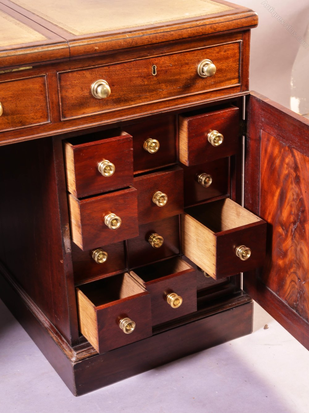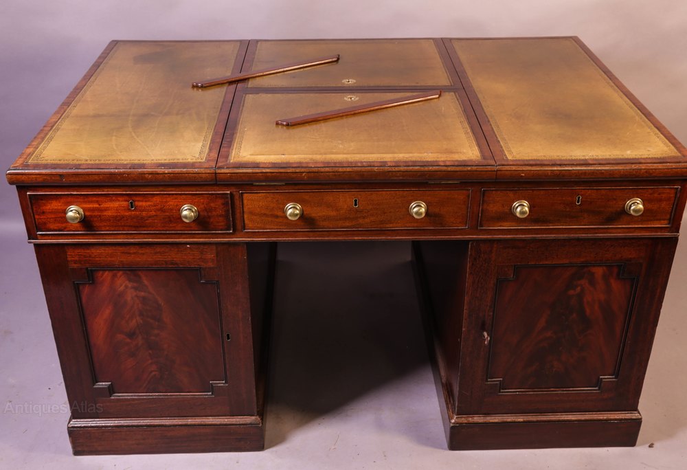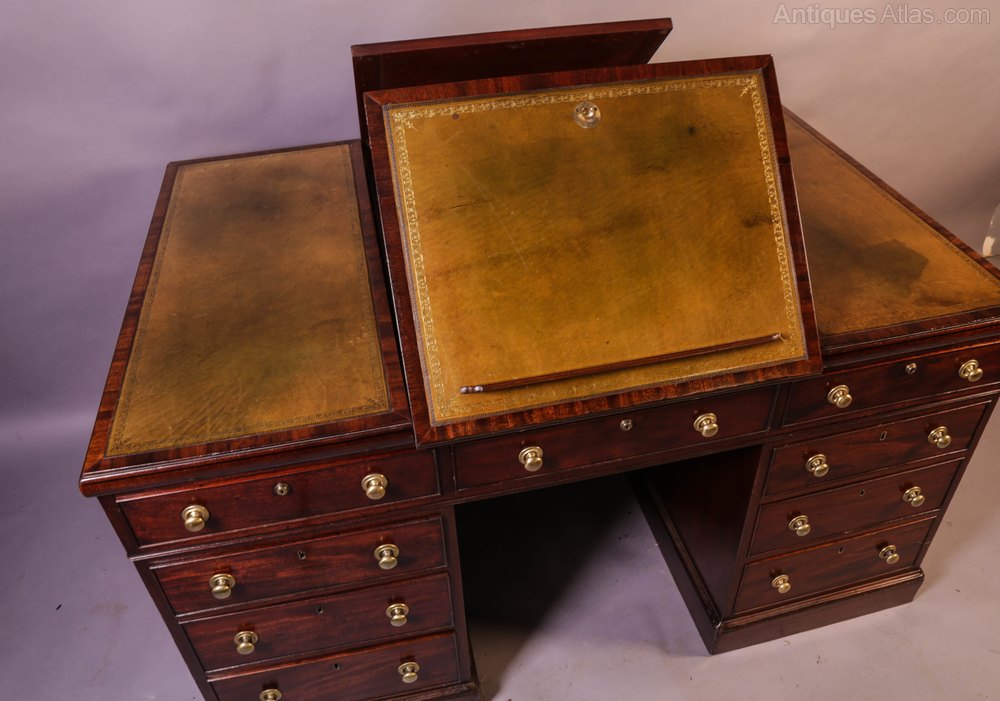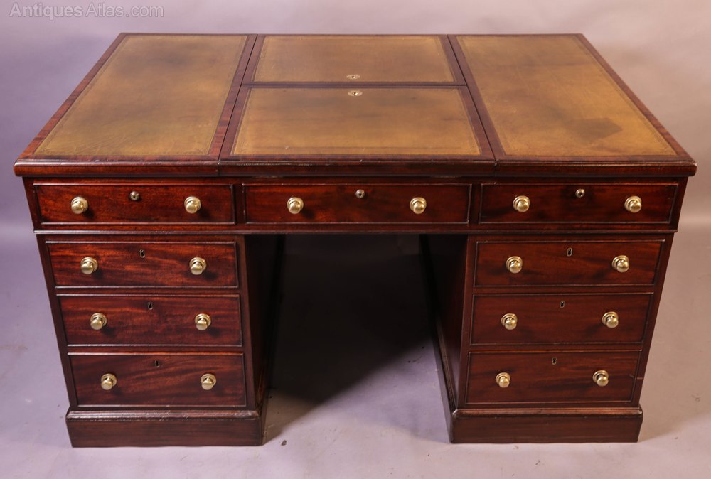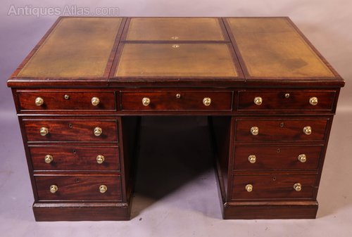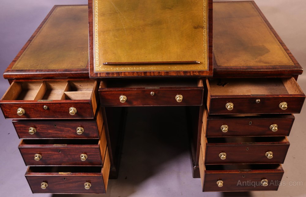 A Superb and Rare Mahogany Partners Desk in Mahogany, it has nine drawers to the front and three drawers to the rear (partners side) plus two cupboards one of these has twelve small drawers inside the other has seven folder compartments. The top has two adjustable reading rests with detachable folio supports, the pale green leather inset has been with the desk a long time but is in very good condition, the drawers liners are Oak ( a sign of quality), the brass handles are original it has keys for all the locks and most are working, it has very well figured mahogany to the drawer fronts and the banding on the top. A great example in Excellent condition.