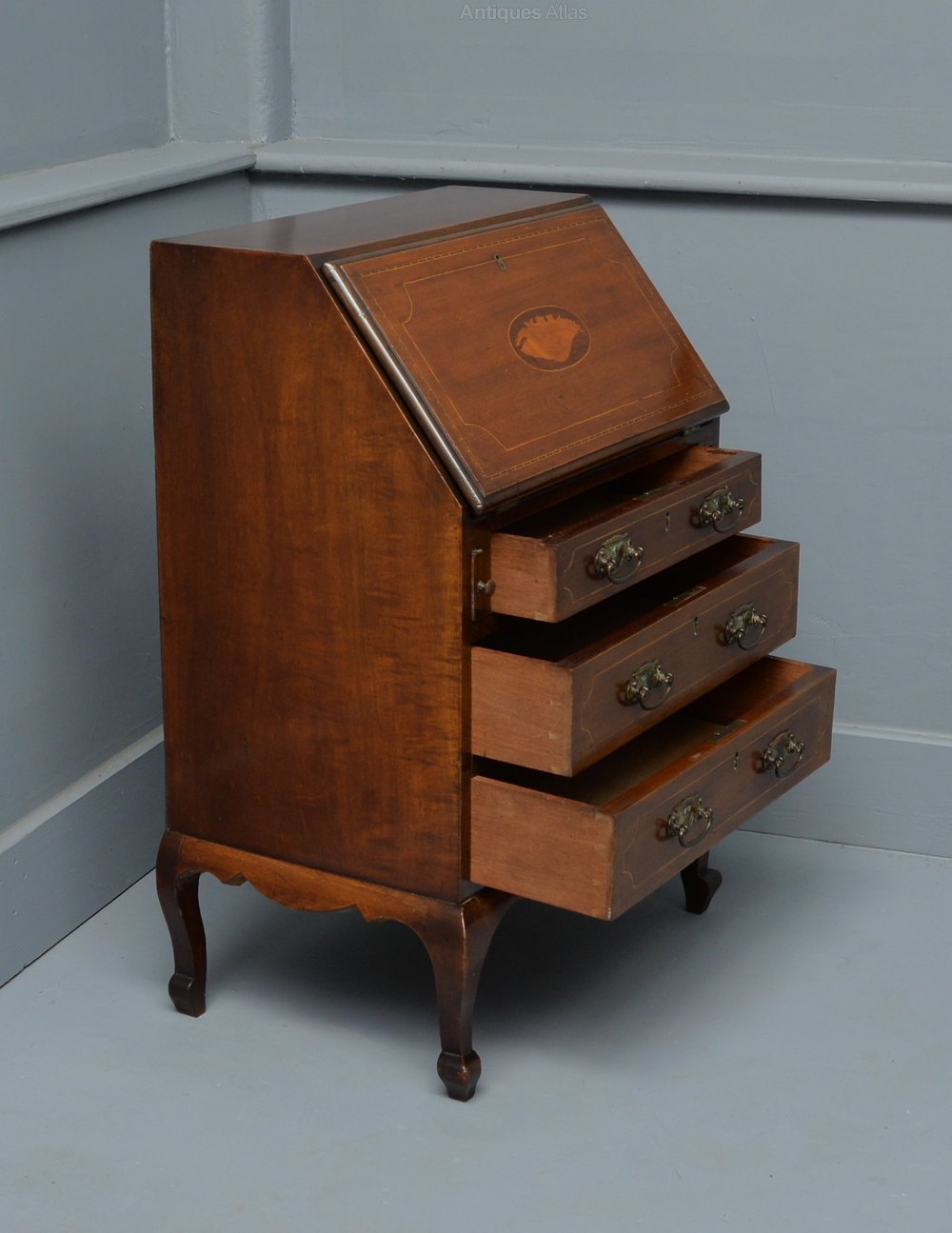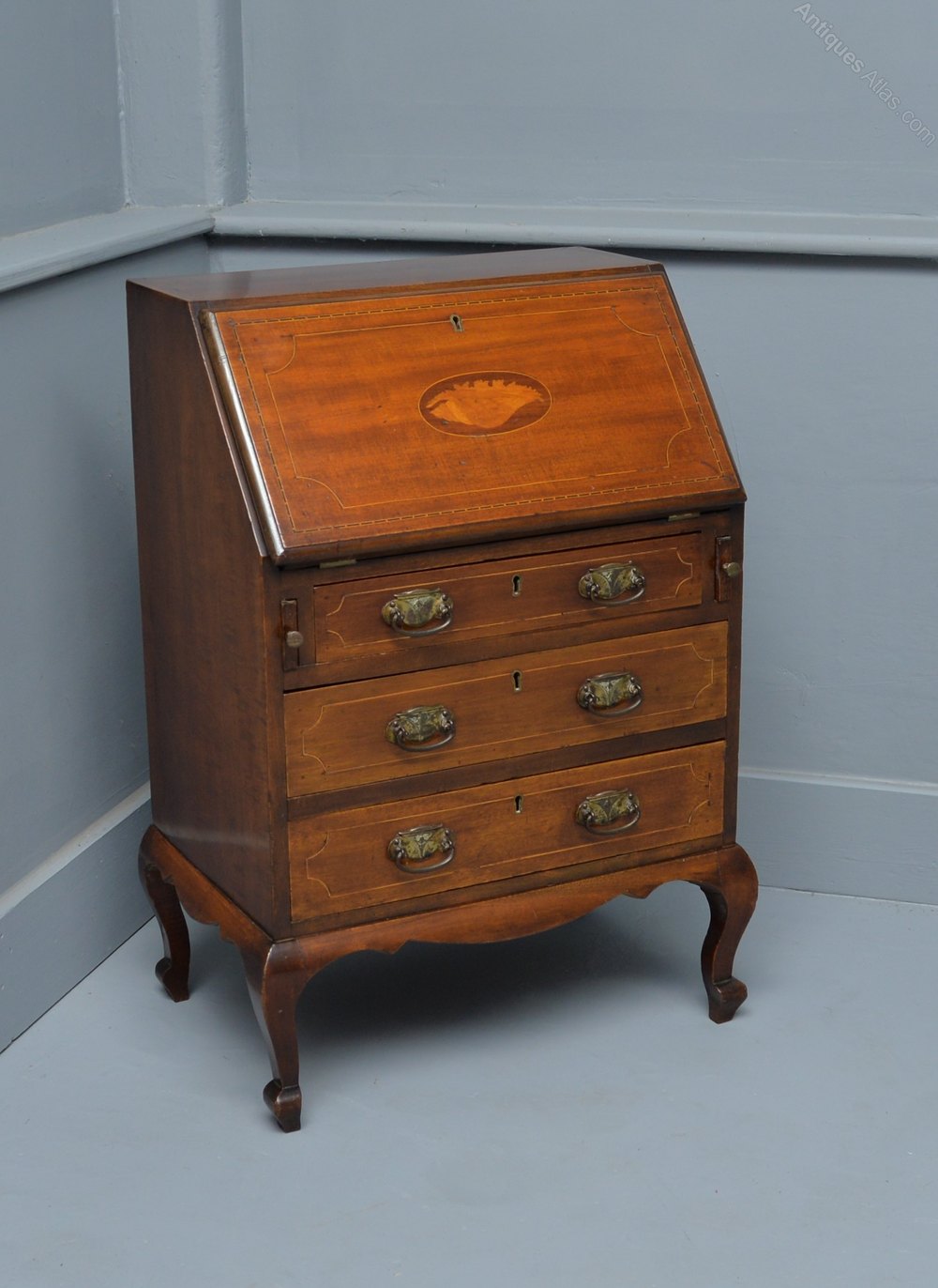 Having a pretty marquetry conch shell inlay to the fall-front, which is a typical late 18th century design and very elegant.