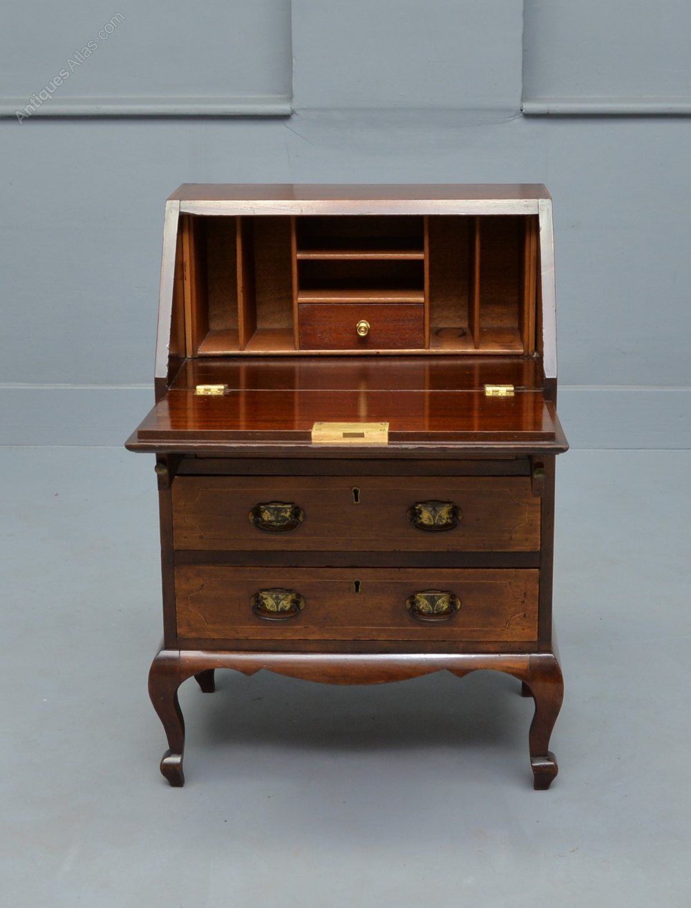 Over three mahogany lined graduating drawers, with boxwood stringing inlay to each drawer and very pretty brass handles.