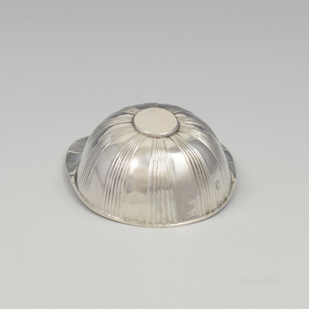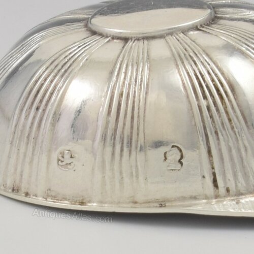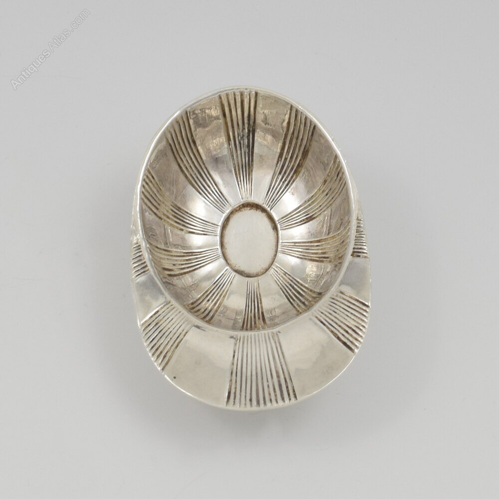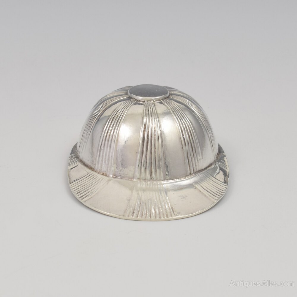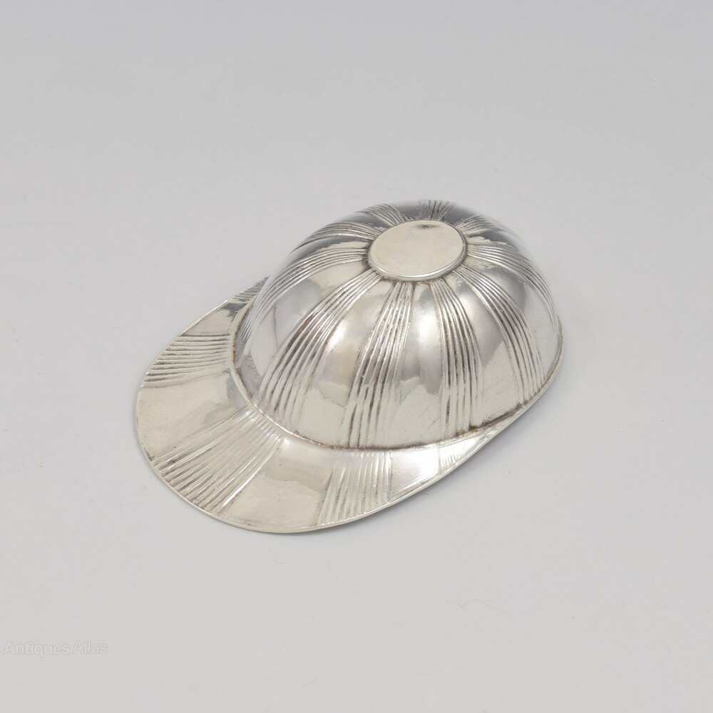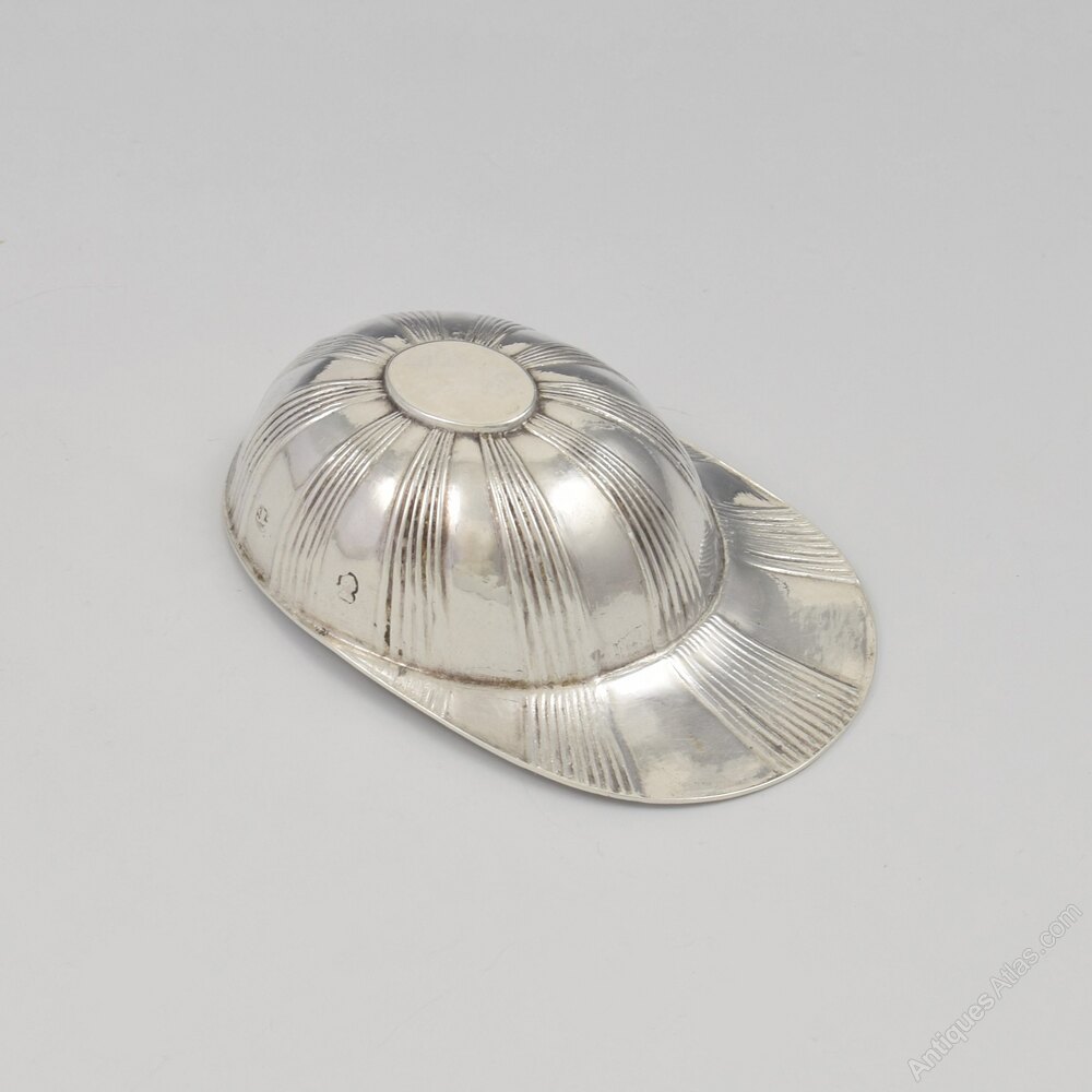 A fine George III silver caddy spoon in the form of a jockey's cap realistically modelled with alternating smooth and raised, ribbed panels and topped with a central oval button. It has partial marks to the side with the lion passant and the head of King George III. No maker's letter but most likely made by Samuel Pemberton in Birmingham, c.1798.