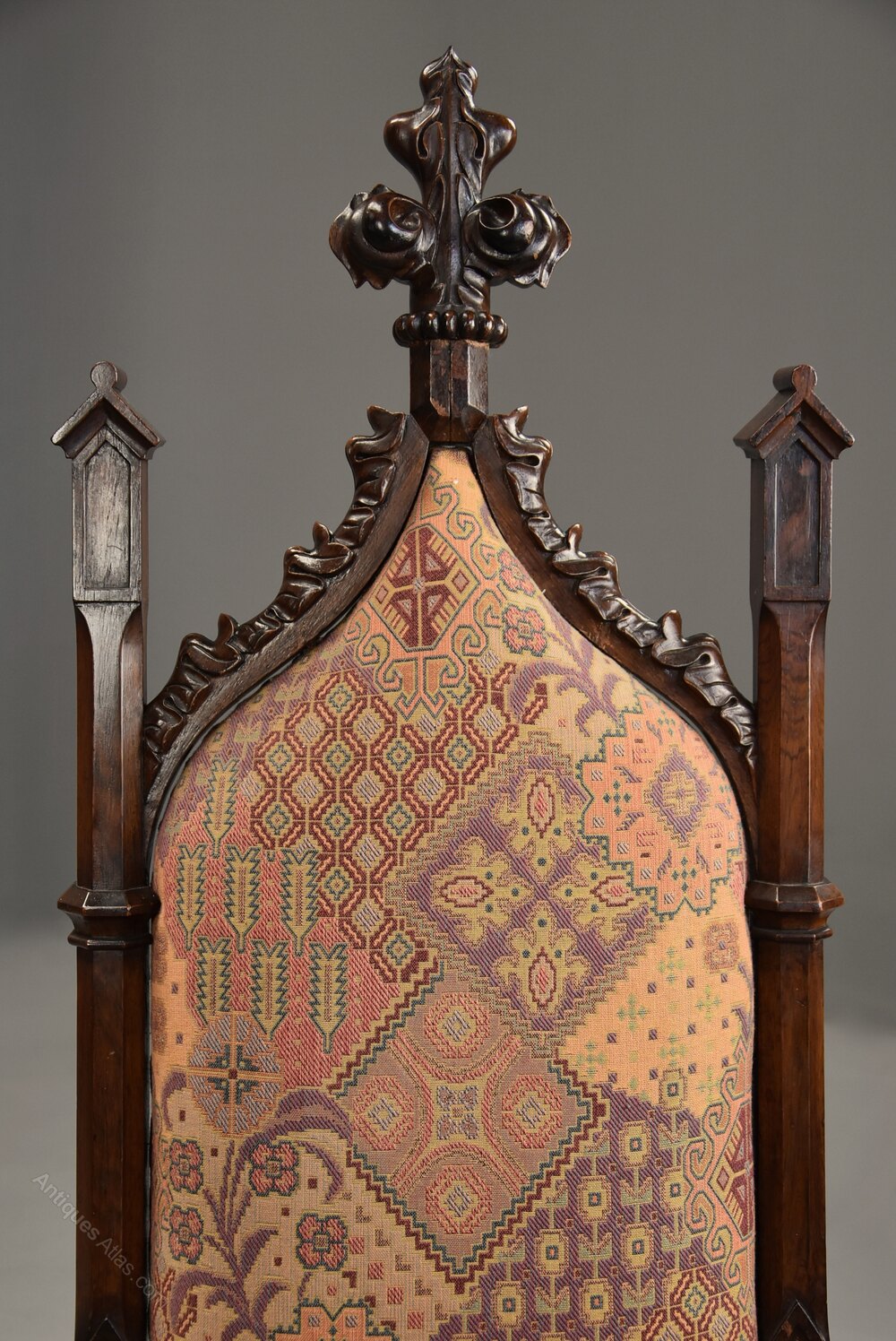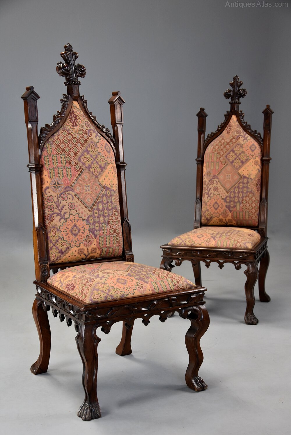 This pair of chairs consist of carved foliate poppy head finial to the centre with typical Gothic lancet arch shaped back with foliate carved decoration, the uprights chamfered with moulded collar and the lower back rail with dentil carved design.