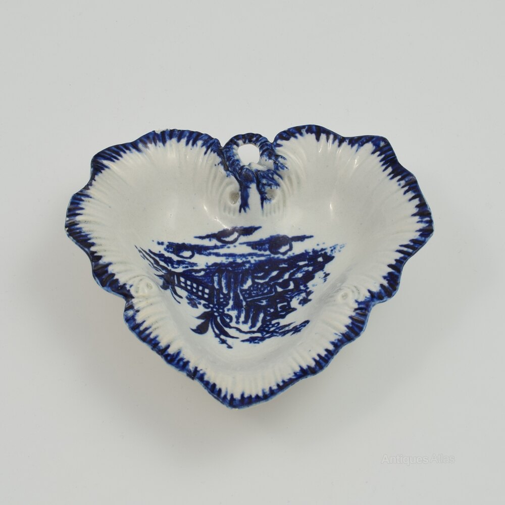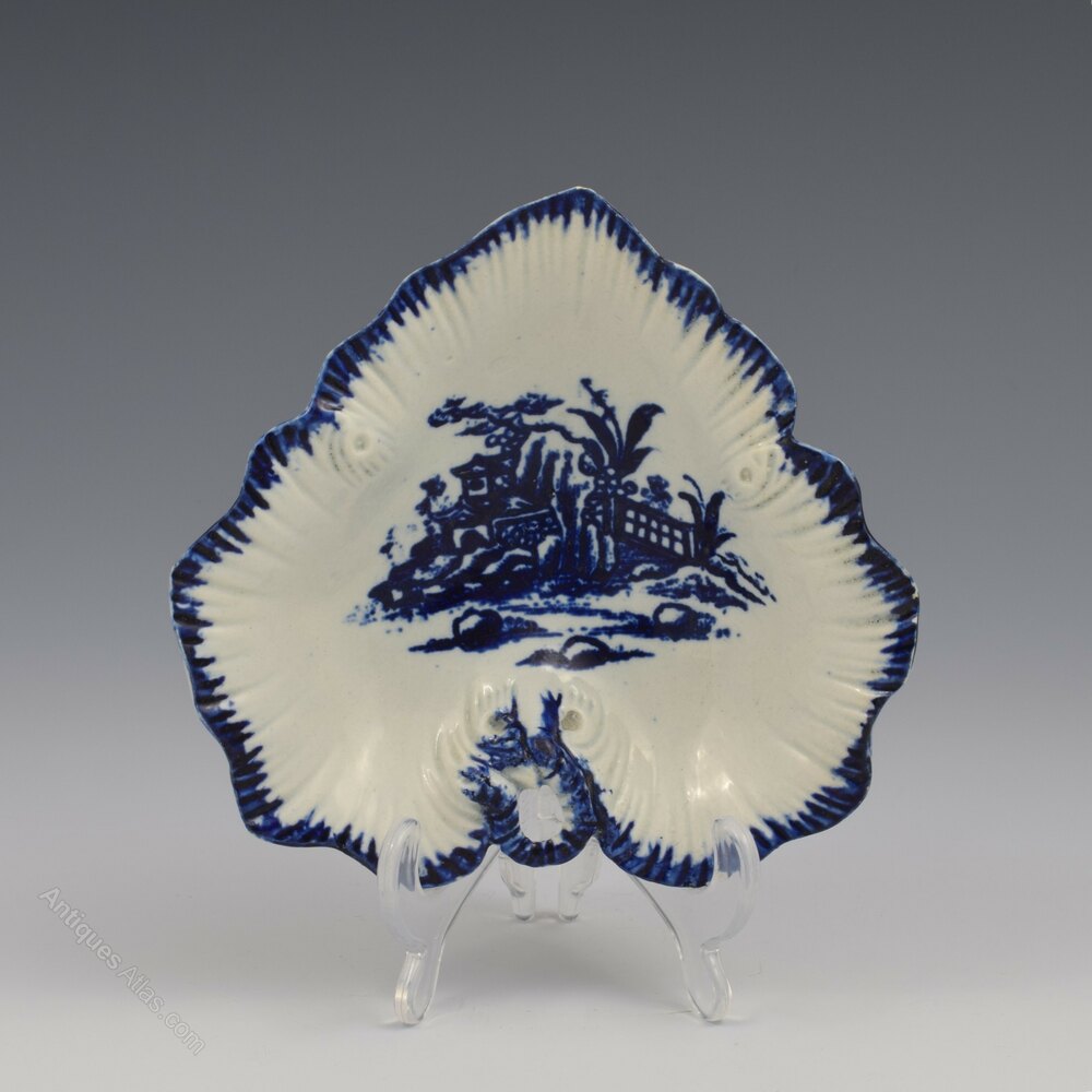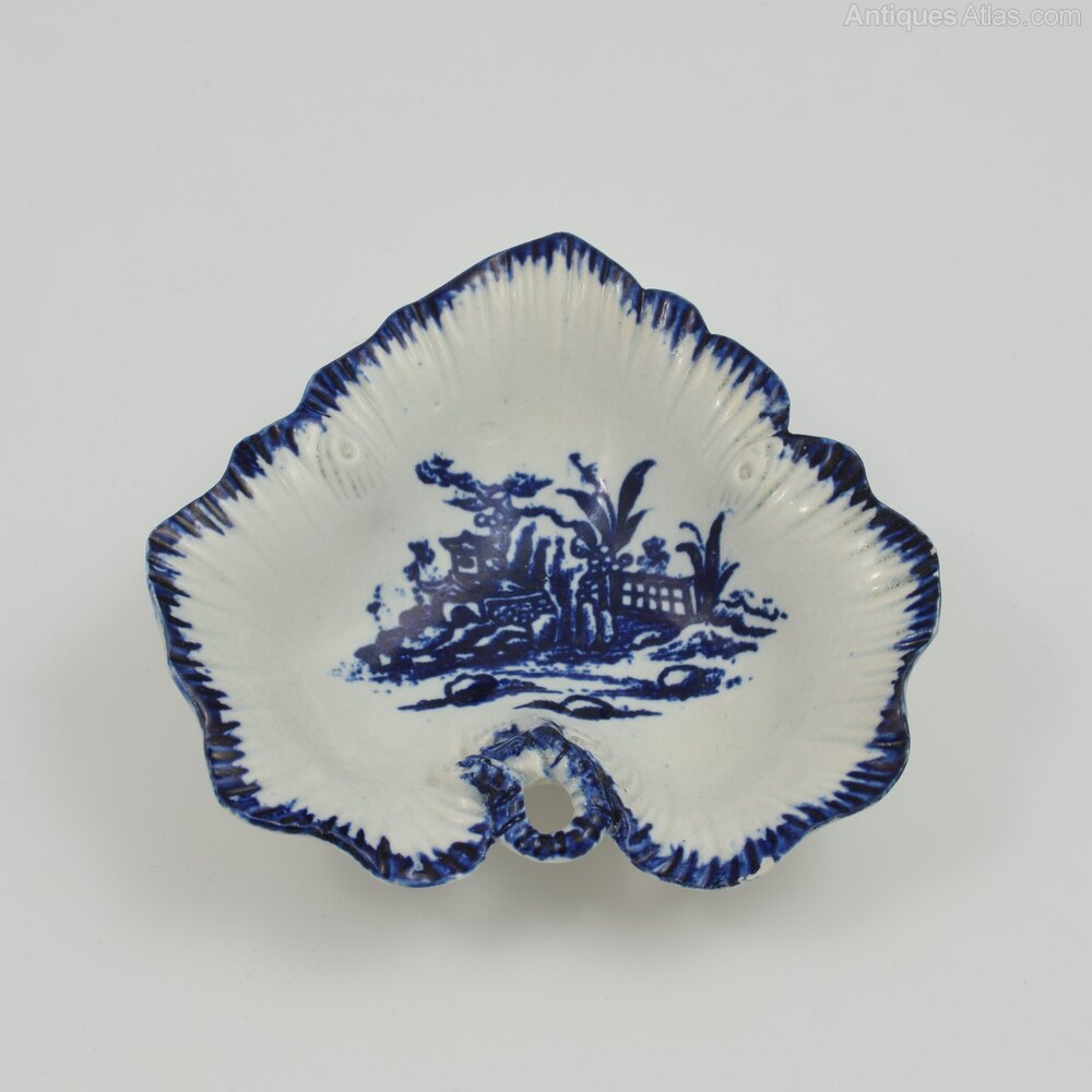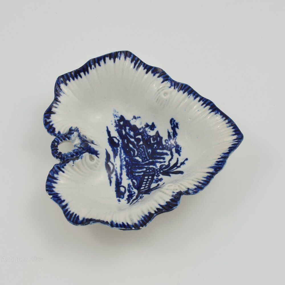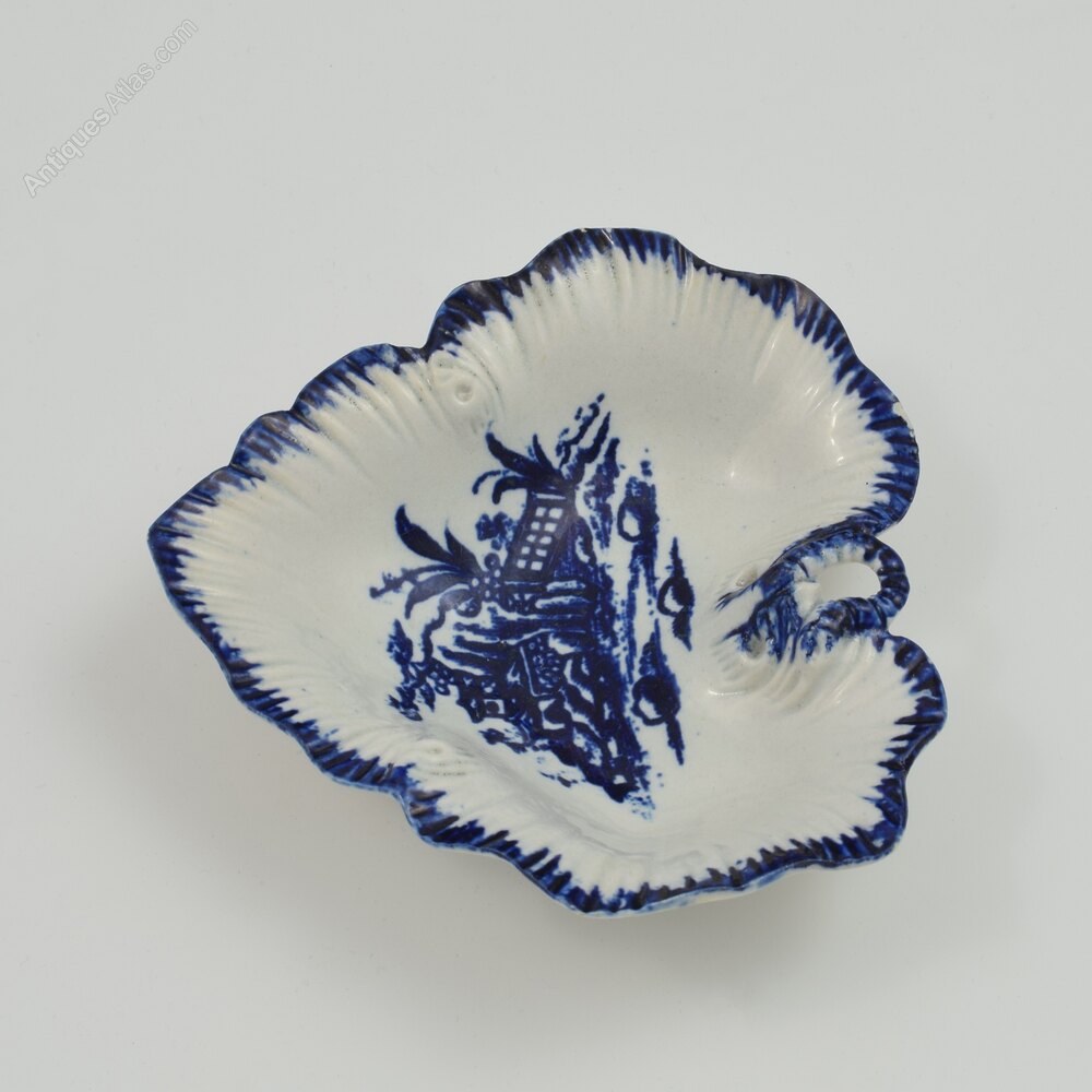 A rare John Pennington porcelain pickle dish formed as a leaf with stalk moulded looped handle, and moulded fluting around the edges. Stood on 3 conical feet. Painted in underglaze blue with a scene of a house up on top of a rocky cliff with fenced garden and three "cannonball" rocks in the water in front. The rim is painted in a feathered style. c.1780.