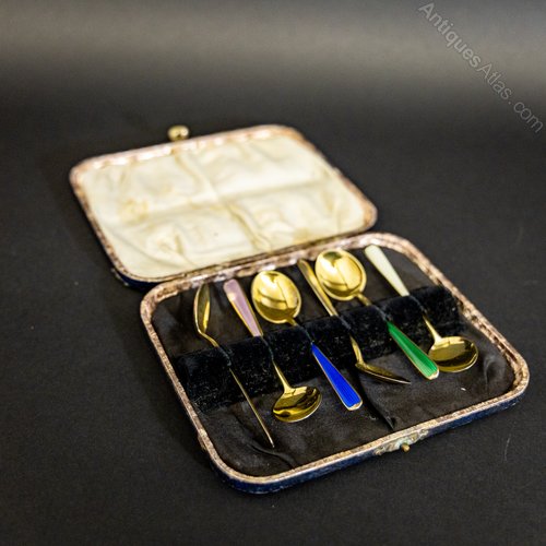 Rare Silver Gilt and Guilloche Enamel Spoons. This beautiful spoons are very well made and have their own distinct colourful design. Cased. Norwegian Hallmarks and made by N.M. Thune. The piece is in good condition with only age related signs of wear. 20th Century, Silver, Norwegian.
