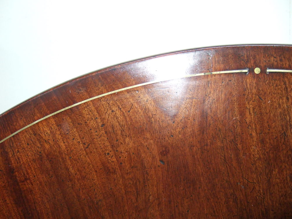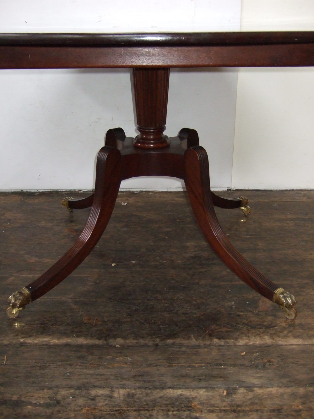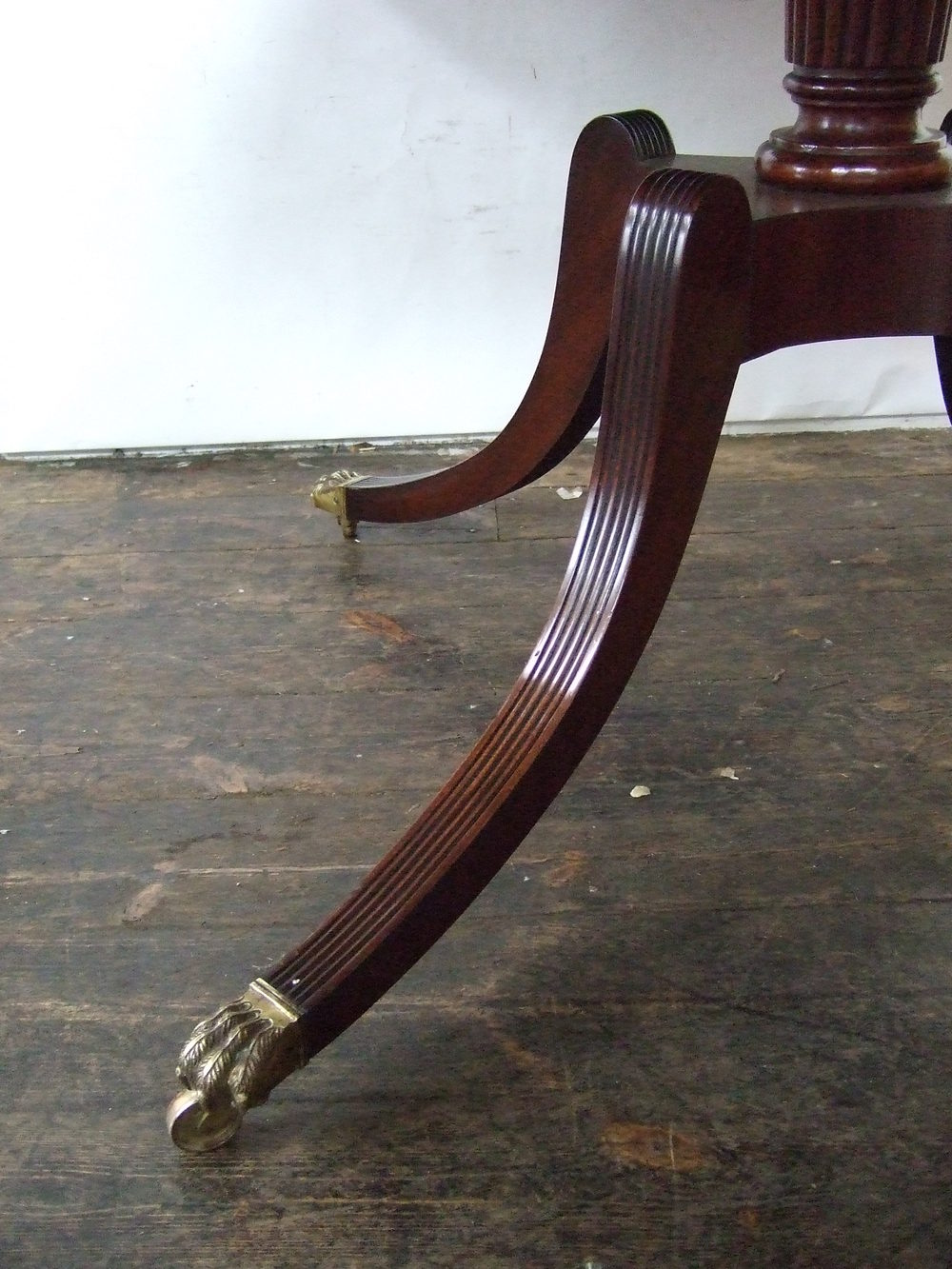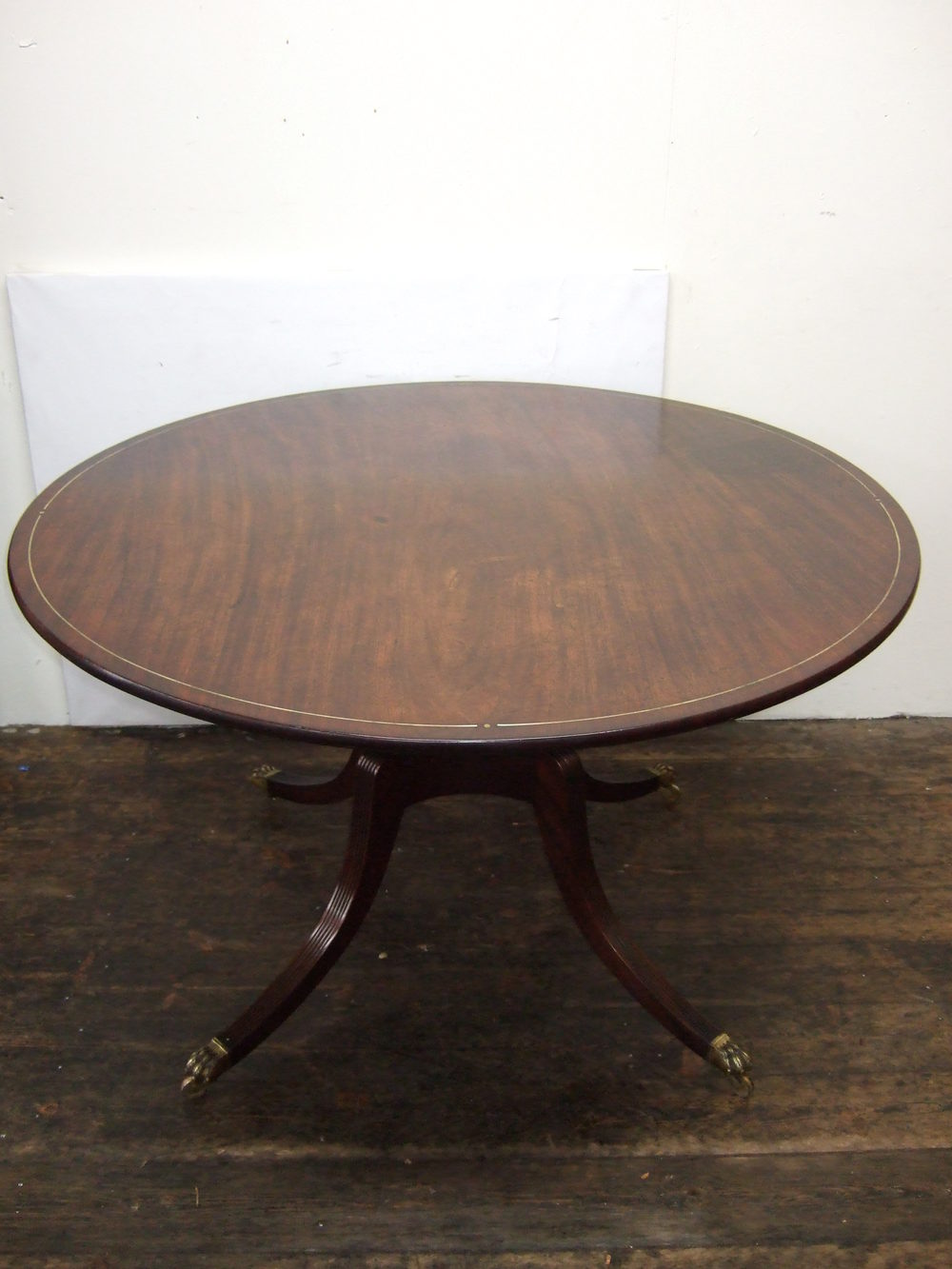 Circa 1815, Regency mahogany and brass inlaid breakfast table, the top has its original colour and patina, stands on fluted tapering column on 4 sweeping ribbed feet finishing with hairy paw brass castors, (with restorations).