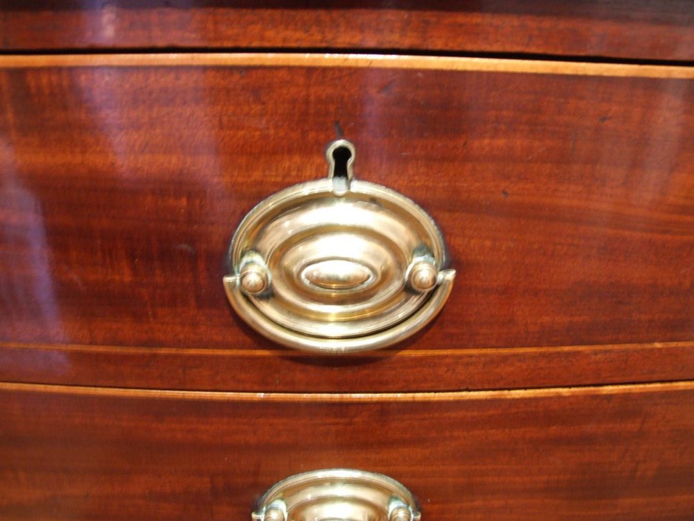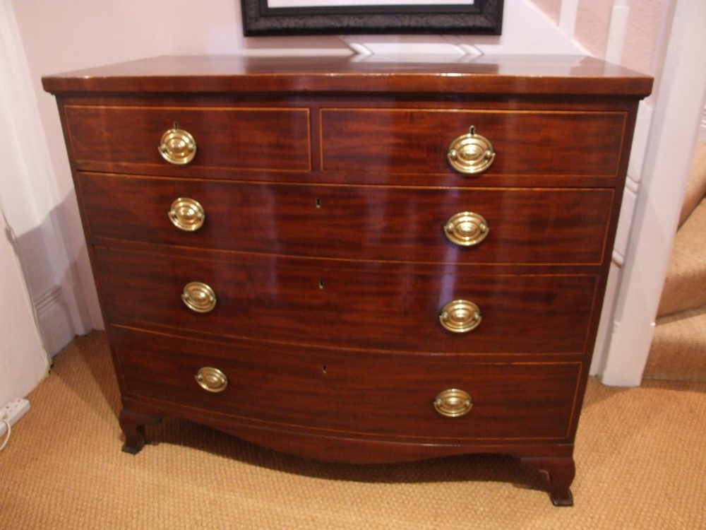 Regency Mahogany Bowfront Chest of Drawers with Satinwood String Inlay and Drawer Tops, Original Brass Fittings and Splayed Feet c1820