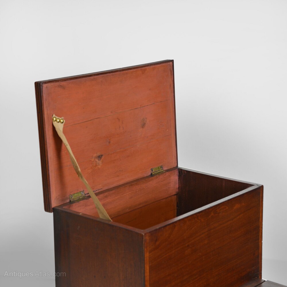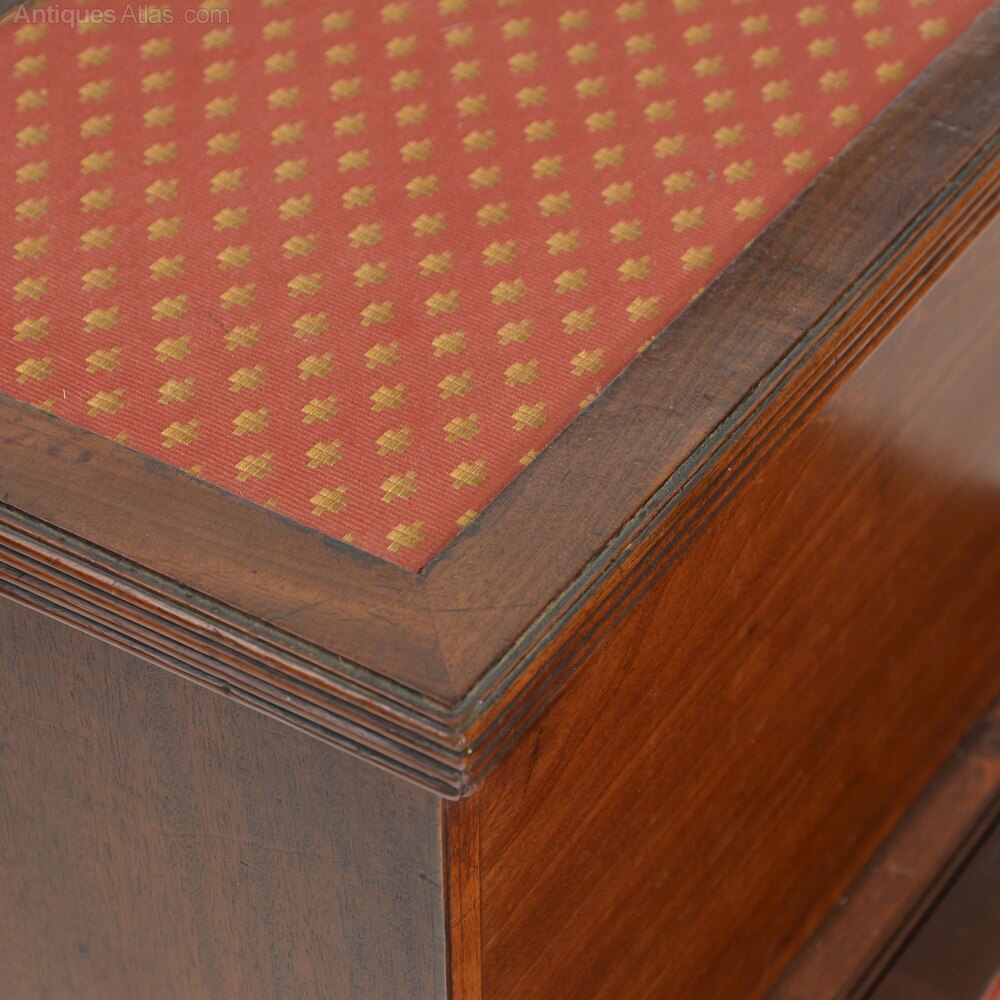 With inset fabric to treads, the top one hinged to a void interior and the middle sliding step also hinged to a void interior. The base and sides with reeded moulding. Stands upon ring turned feet.