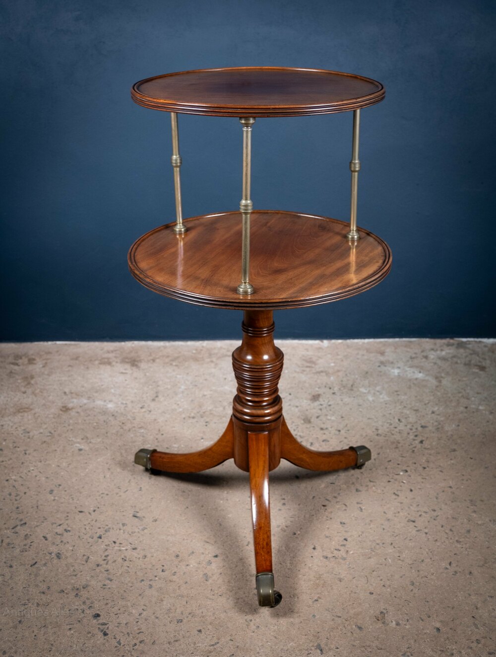 The two moulded mahogany circular tiers are joined by three finely turned brass columns, with the whole being raised upon a tightly turned column and three downswept legs terminating in brass caps and castors.