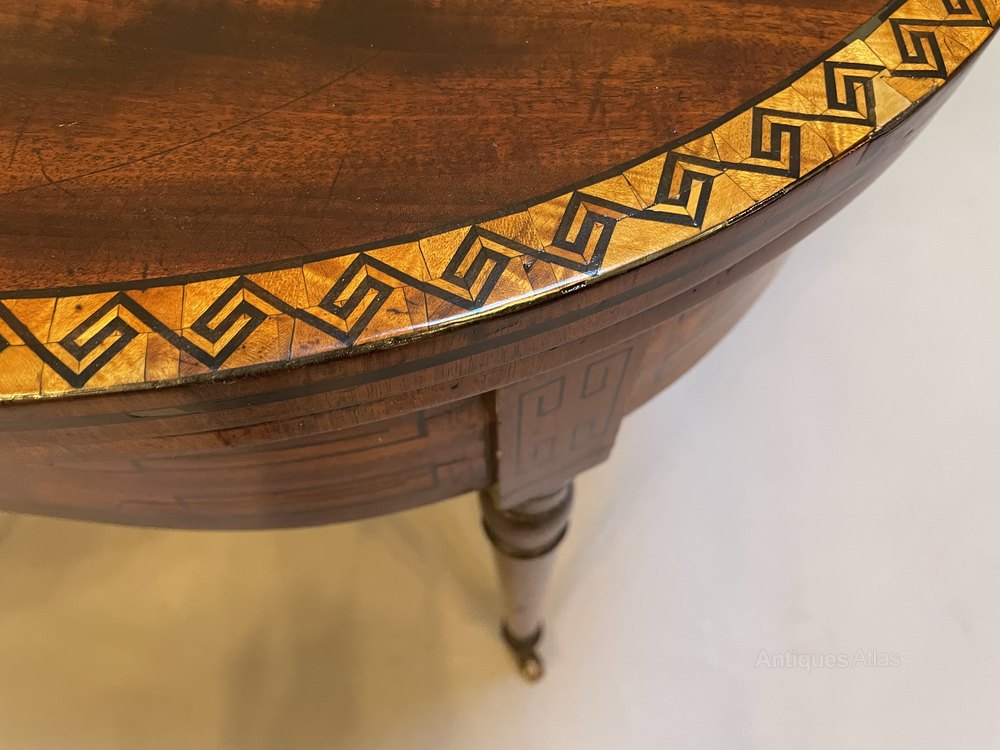 Well figured mahogany of good colour, the D shape foldover top crossbanded and Greek -key ebony inlaid over ebony strung frieze and raised on ring turned supports to castors