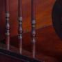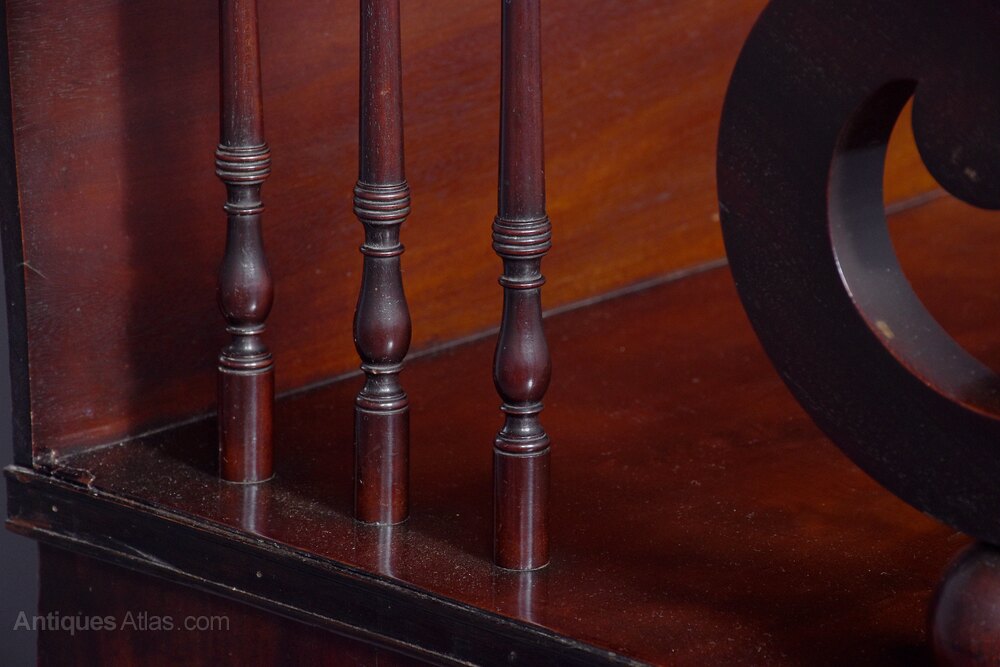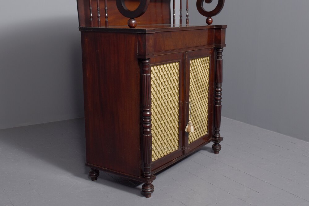 Circa 1820, a large and stylish and unusual Regency Mahogany chiffonier, the tall back with a small arch upright, with top shelf being supported on a wildly scrolling supports, the smaller shelf supported on three turned and ring turned tapering balustrades, the frieze with two break front sections at each end conceals a full-sized drawer, beneath this is a pair of doors with brass mesh panels, inside a single shelf, the doors are flanked by a pair of elegant, turned and tapering and fluted columns resting r on a block, the piece is supported on four elegant turned feet.