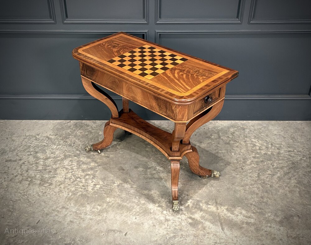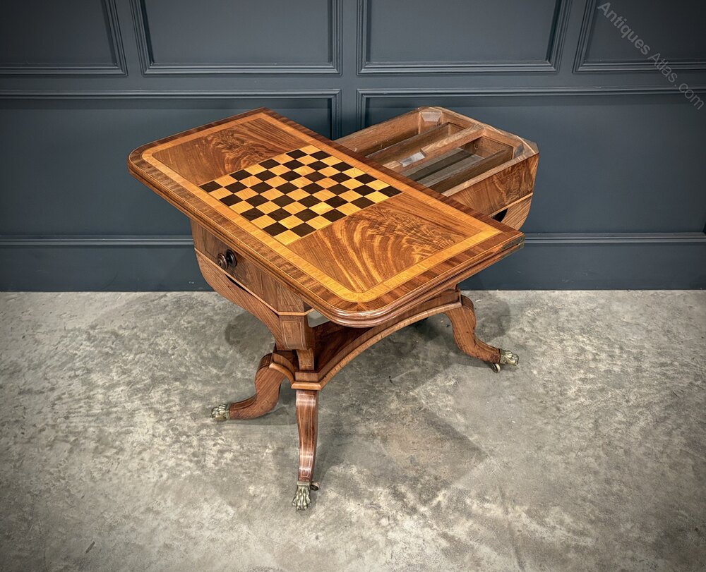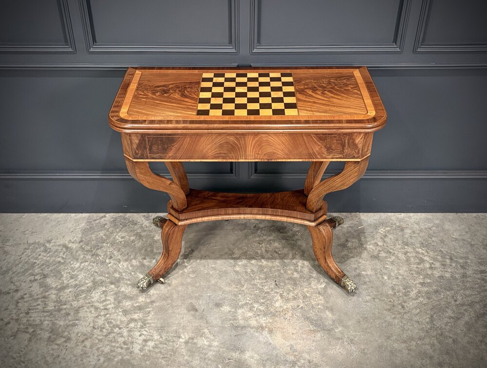 The rectangular top lifts and swivels to reveal a playing surface with satinwood inlaid border, the upper side featuring a striking ebony and satinwood inlaid chessboard.