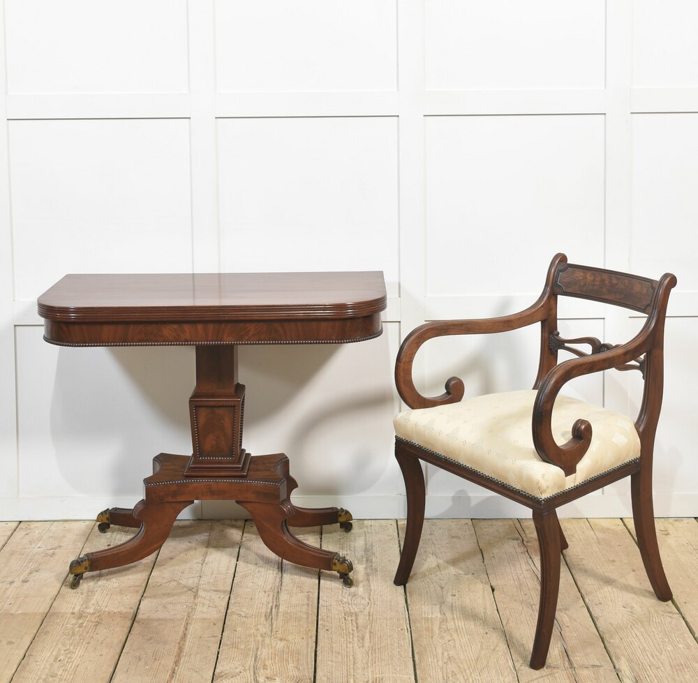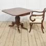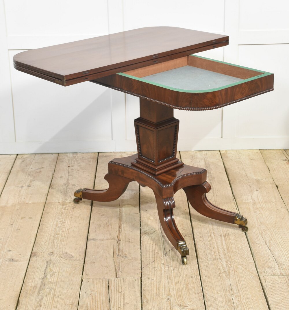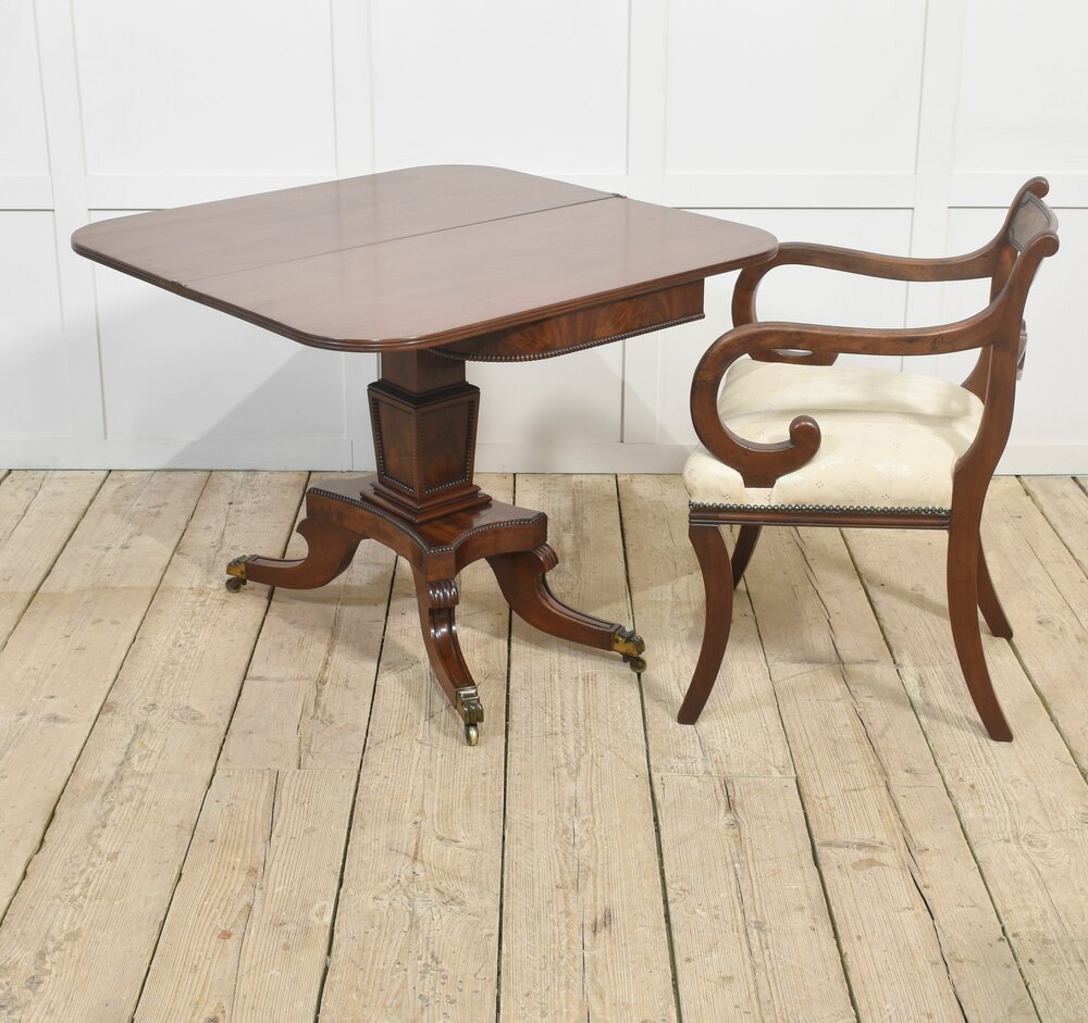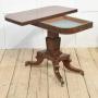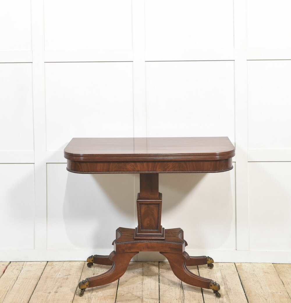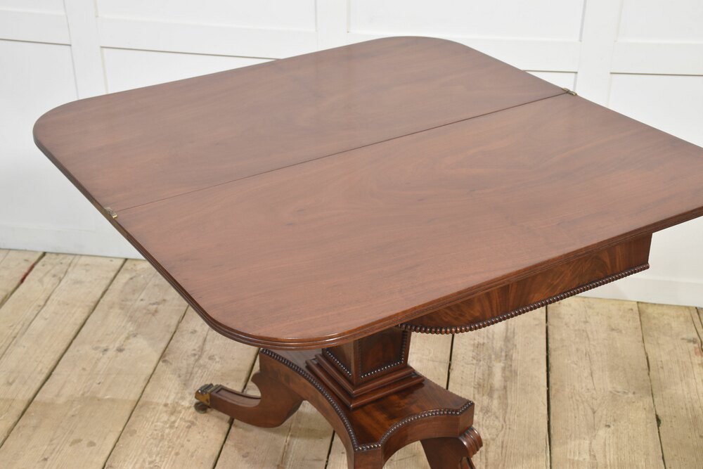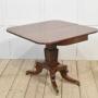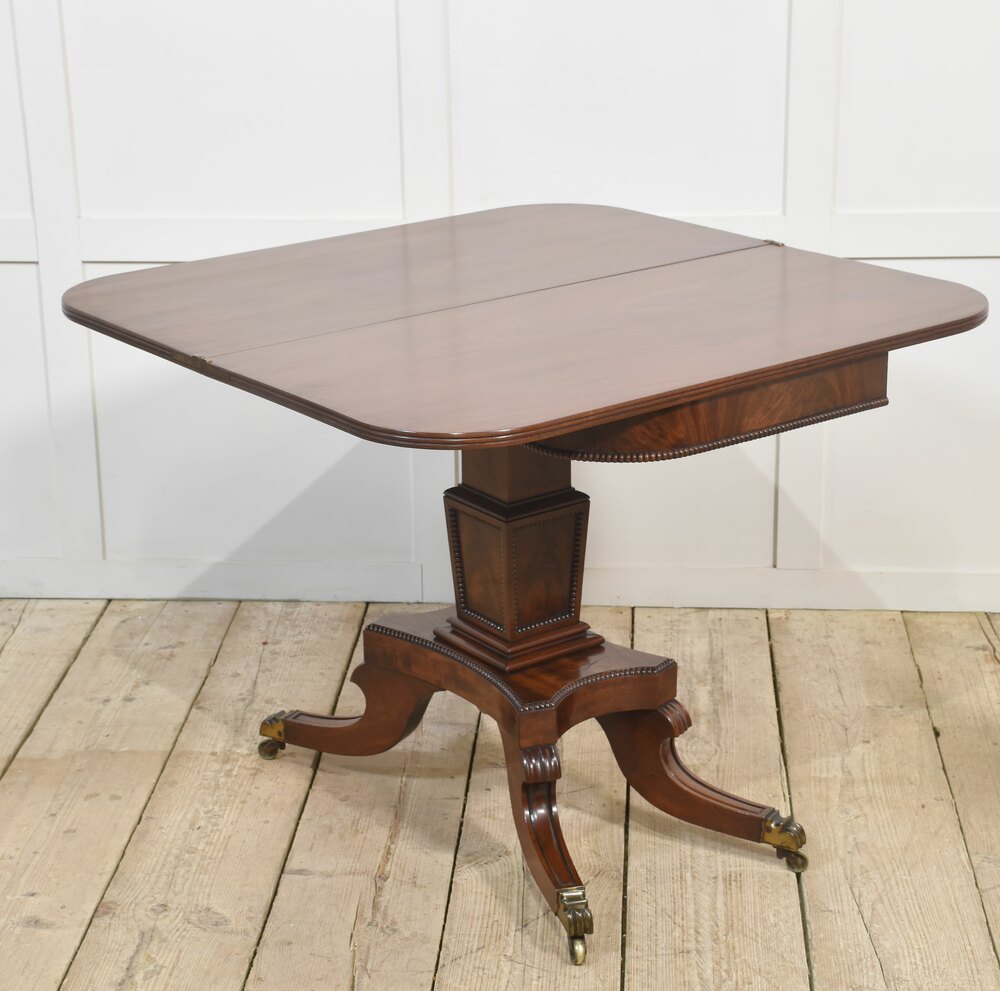 Mahogany tea table, the rectangular hinged top with rounded corners on a square column and stepped splayed quadriform base. Terminating in brass caps and castors