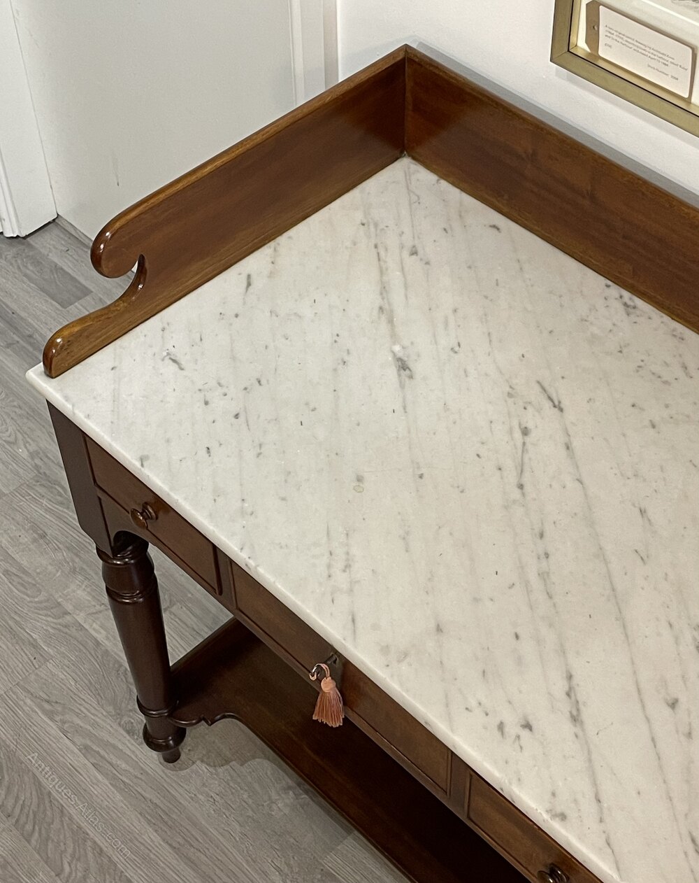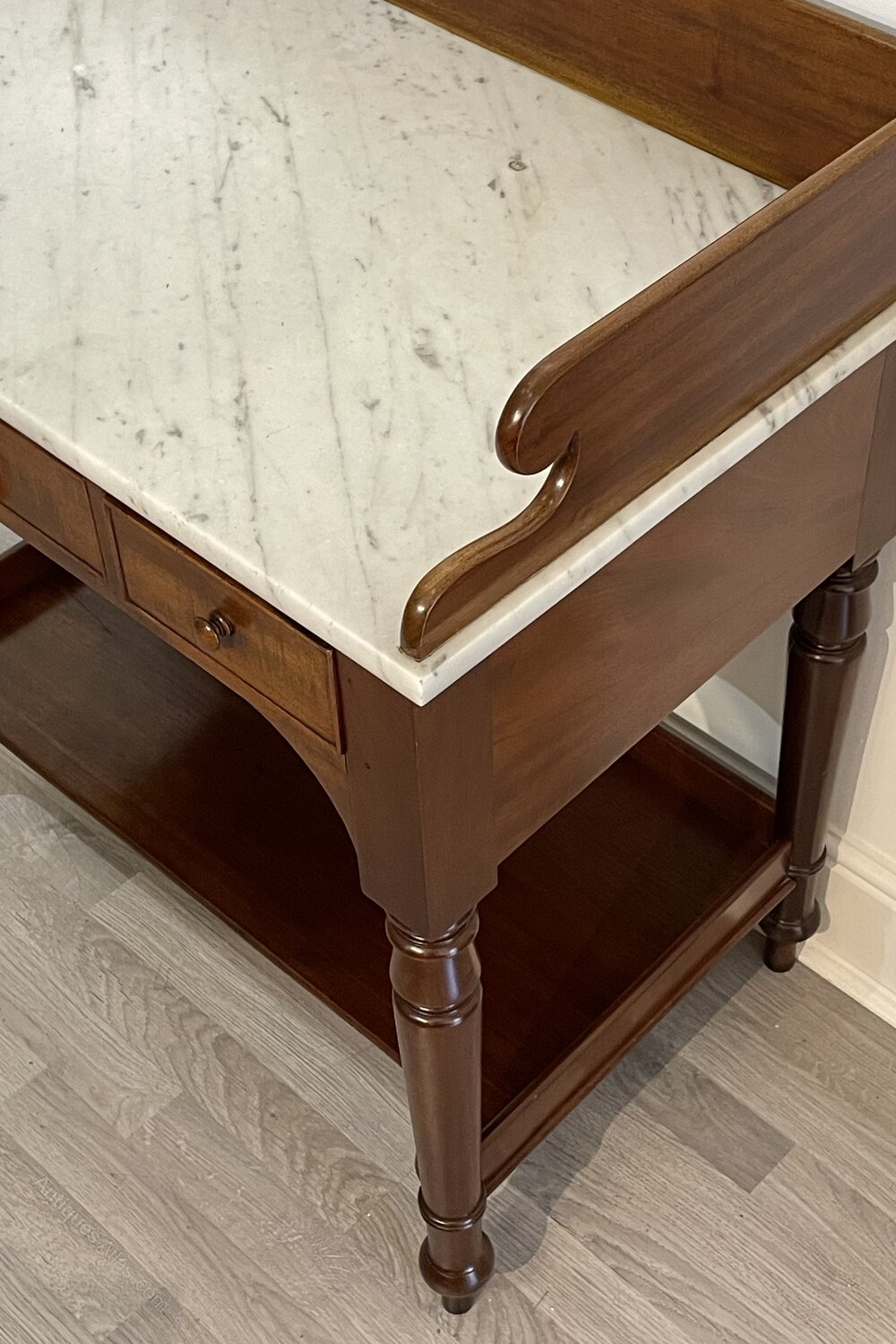 A super quality Regency mahogany wash stand or dressing table, with original veined white marble top with a solid mahogany surround with beautiful scrolling sides.