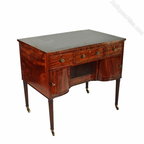 The table stands on four tapering reeded legs, has one left hand mahogany lined drawer and two dummy drawers all with original gilt brass knob handles.