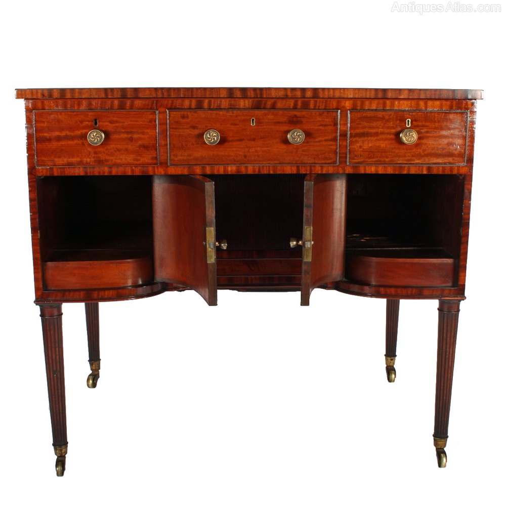 To each side of the knee hole is a bowed and inlaid door with it's original knob handle and to the centre of the knee hole a cupboard with a tambour sliding door.