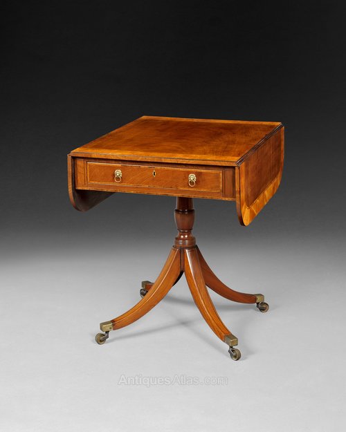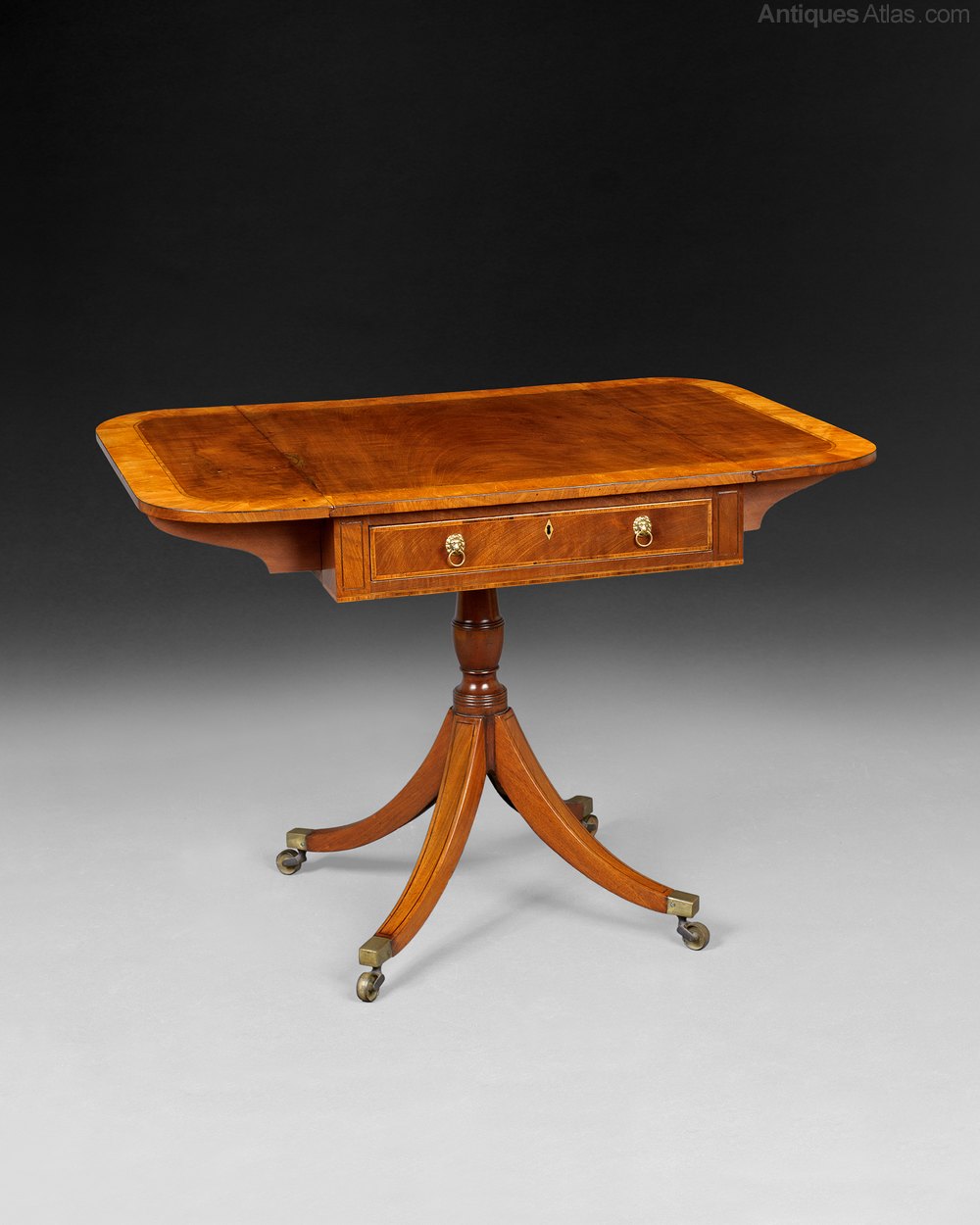 A very pretty Regency Period Mahogany Pembroke Table, the rectangular top with a broad band of Satinwood Crossbanding and rounded corners to the twin flaps above a single frieze drawer and raised on a centre column with four splay sabred legs terminating in brass cups and casters.
