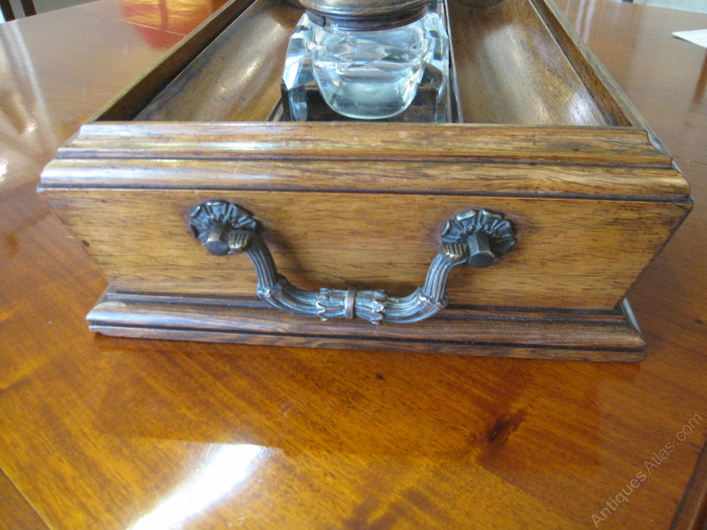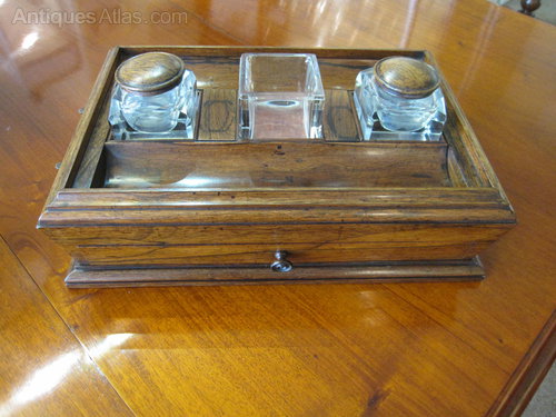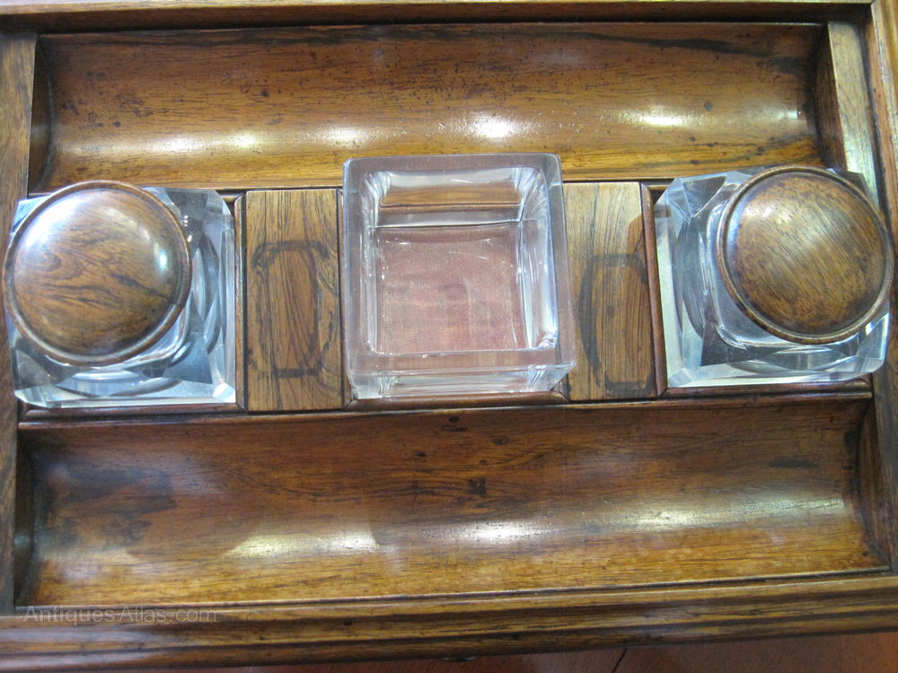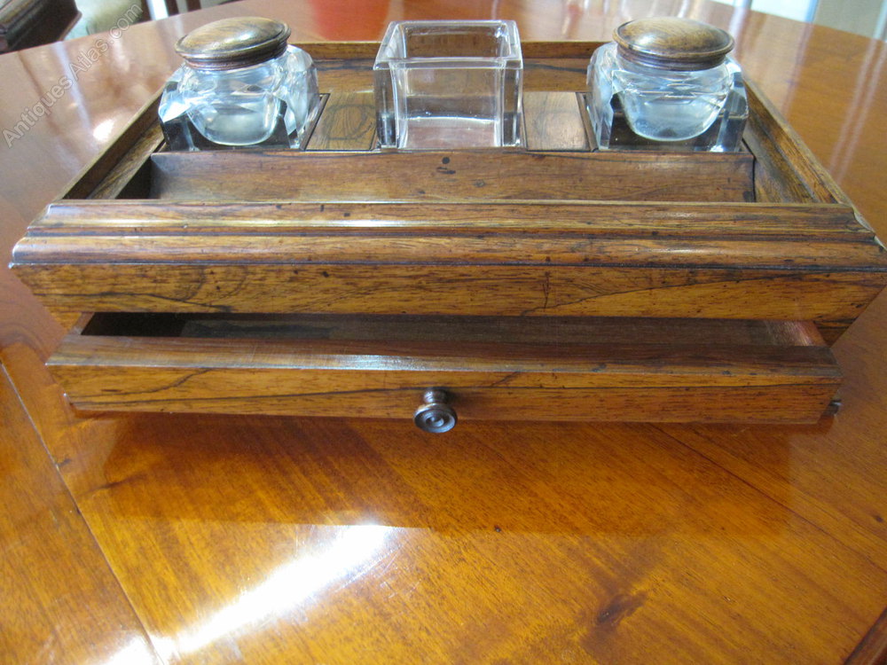 Excellent Quality early 19th Century Rosewood Standish with two glass Inkwells with Rosewood Covers, central square glass pot for French Chalk (possibly had lid), two concave Pen Trays,long drawer to base. Superbly cast Brass Carrying Handles. c. 1810-20