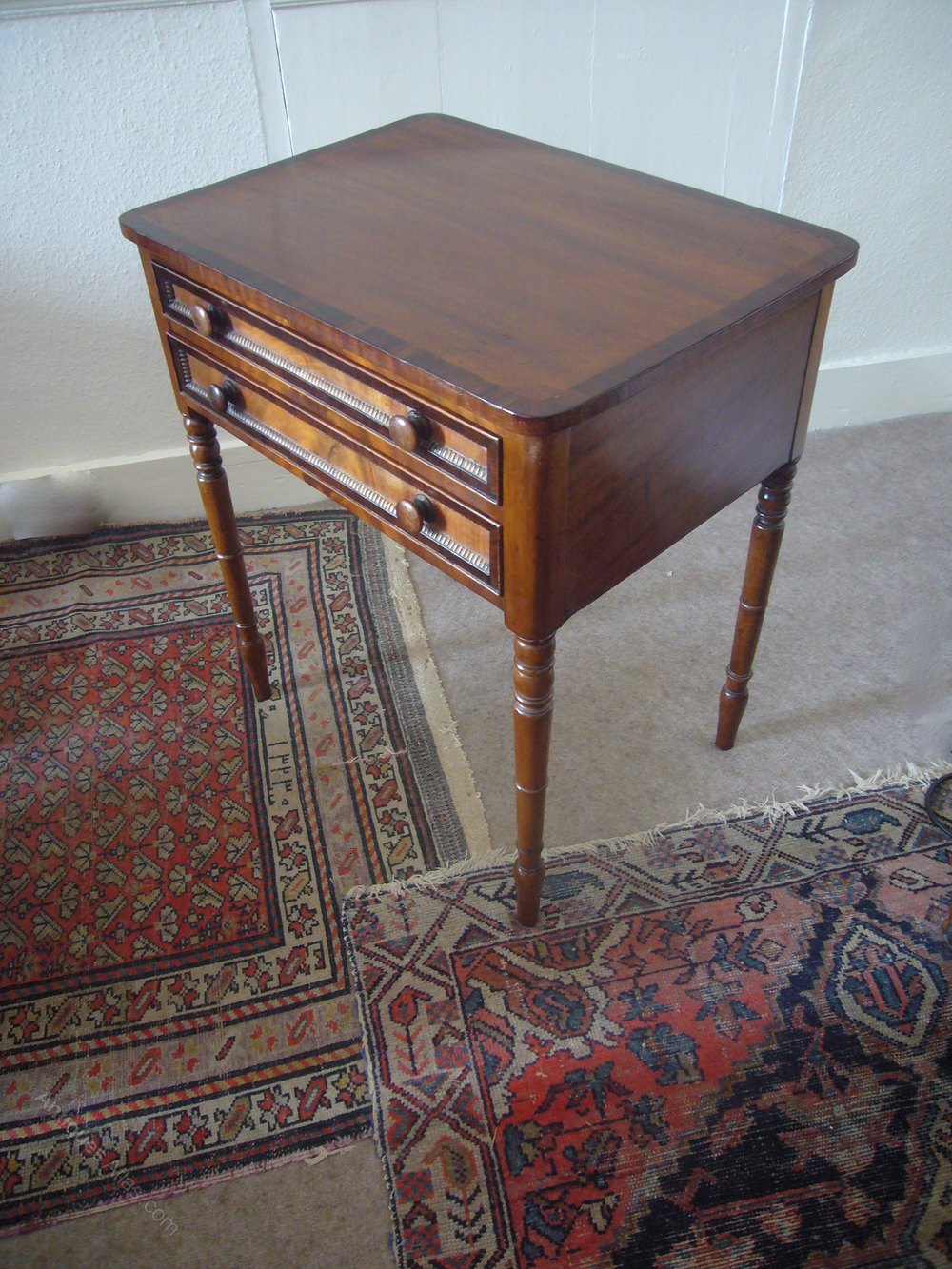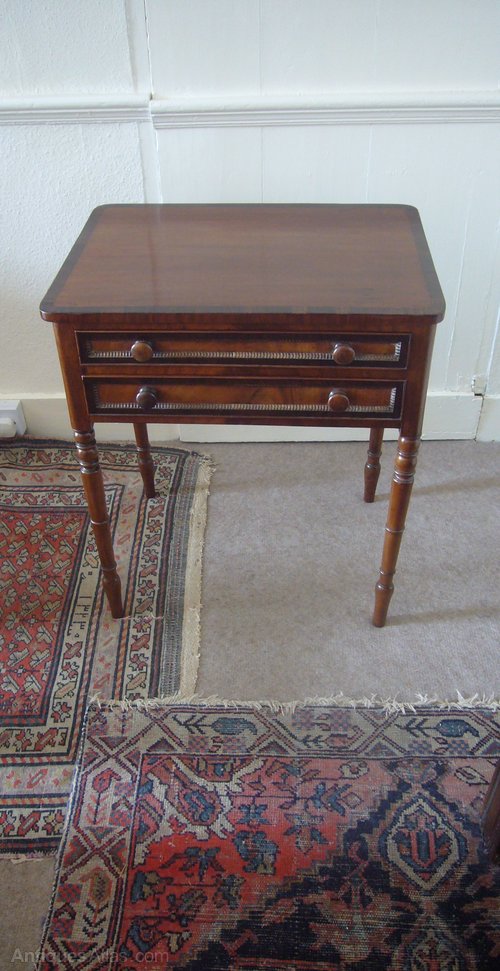 A Regency small mahogany centre/work table with rosewood cross bandings.Fitted two narrow drawers with opposing dummy drawers.Original knobs.Ring turned legs.Top and drawers crossbanded in rosewood.