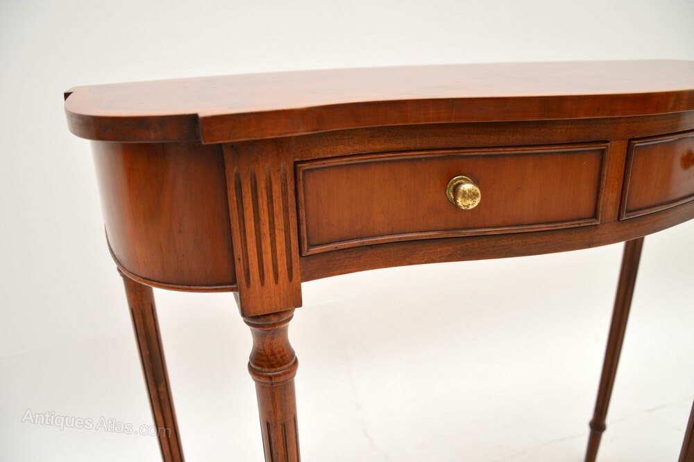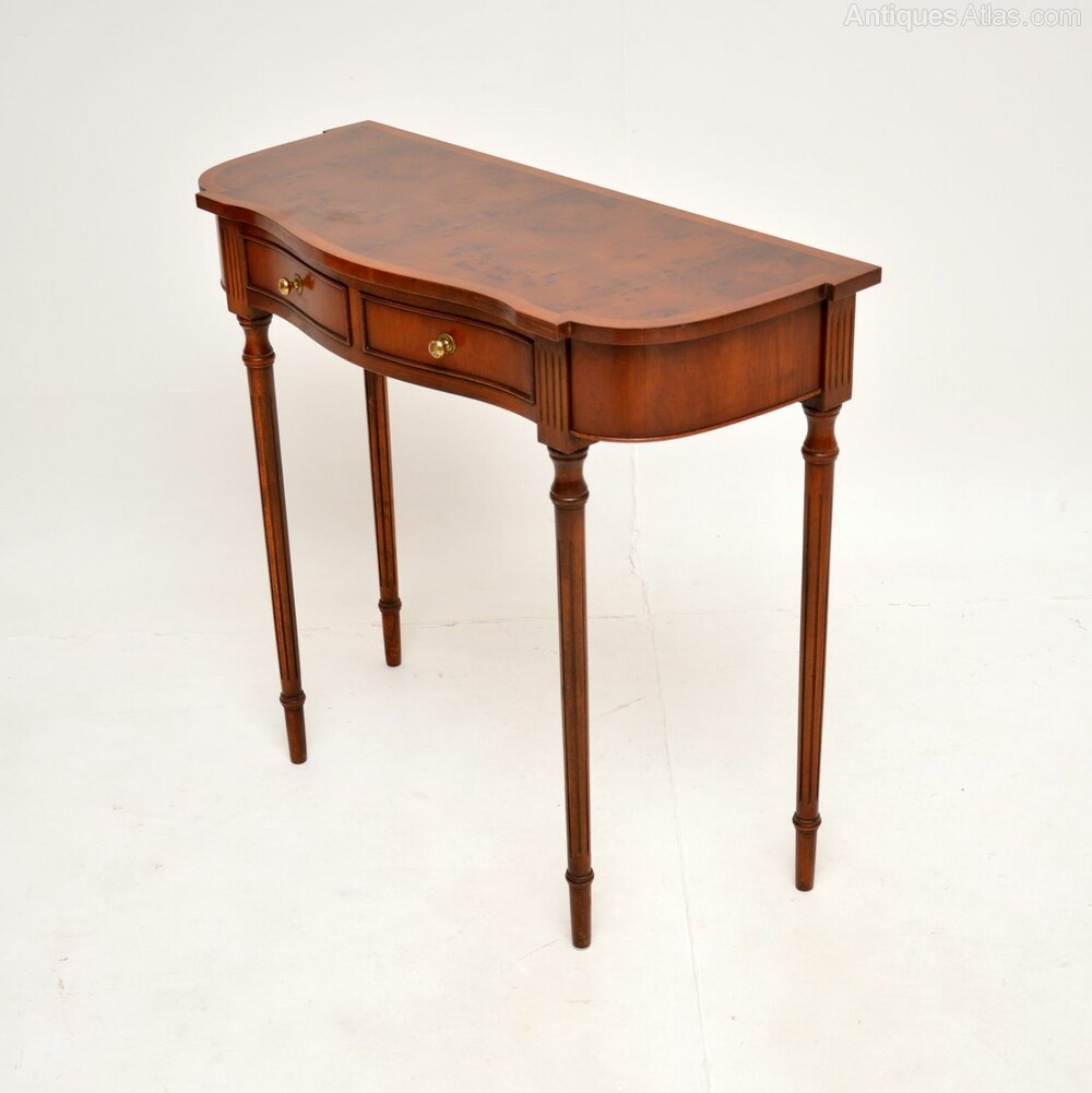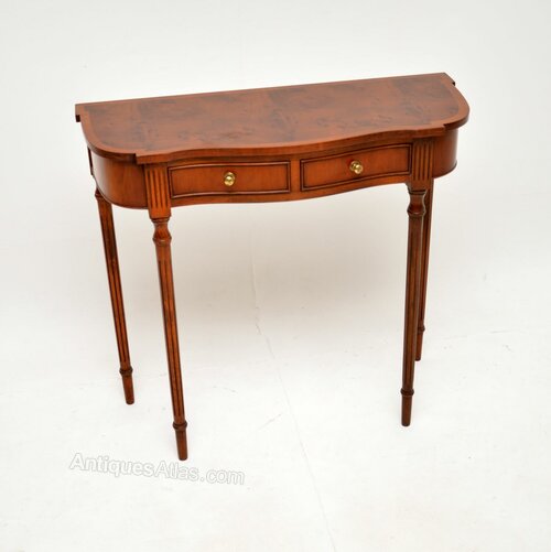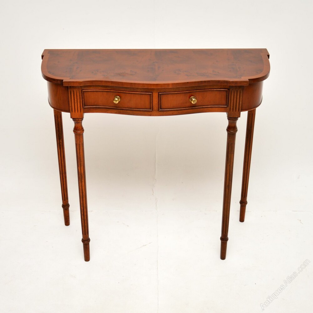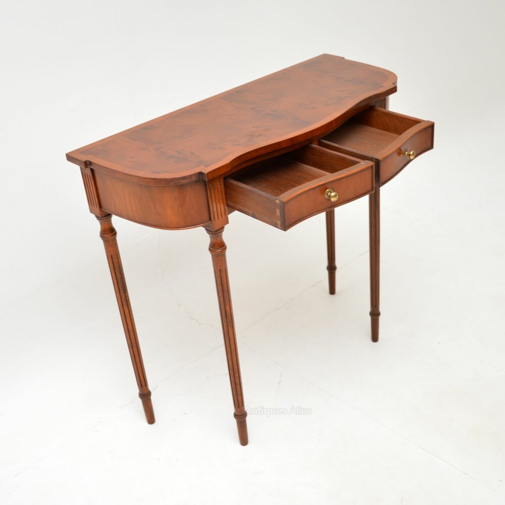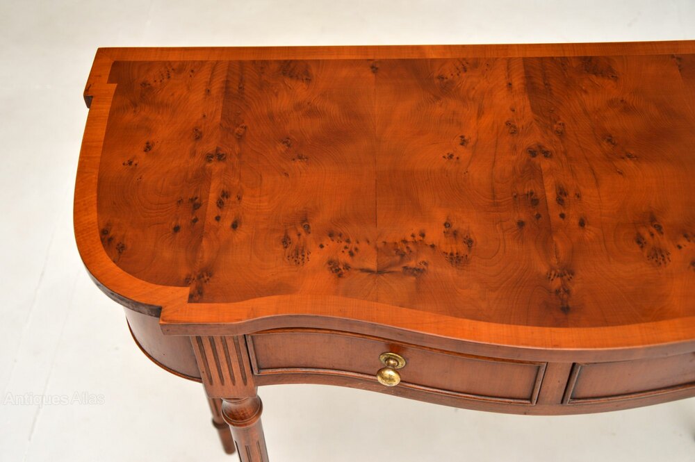 A fine and elegant antique Regency style yew wood console table. This was made in England, it dates from around the 1950’s.
