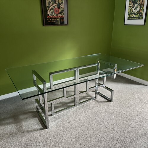 A Romeo Rega steel and glass dining table dated c. 1970. The heavy chromed steel base is articulated and can be used in any configuration. The thick glass top rests on the base.