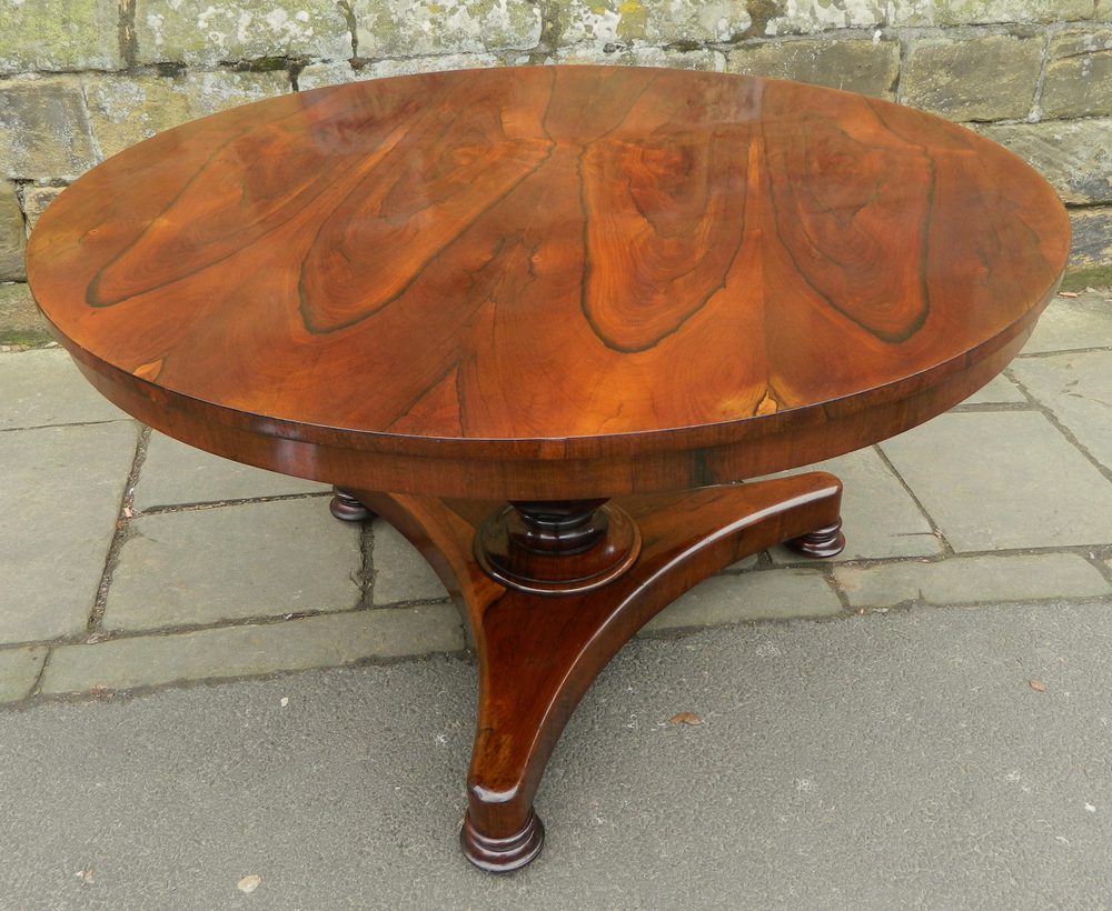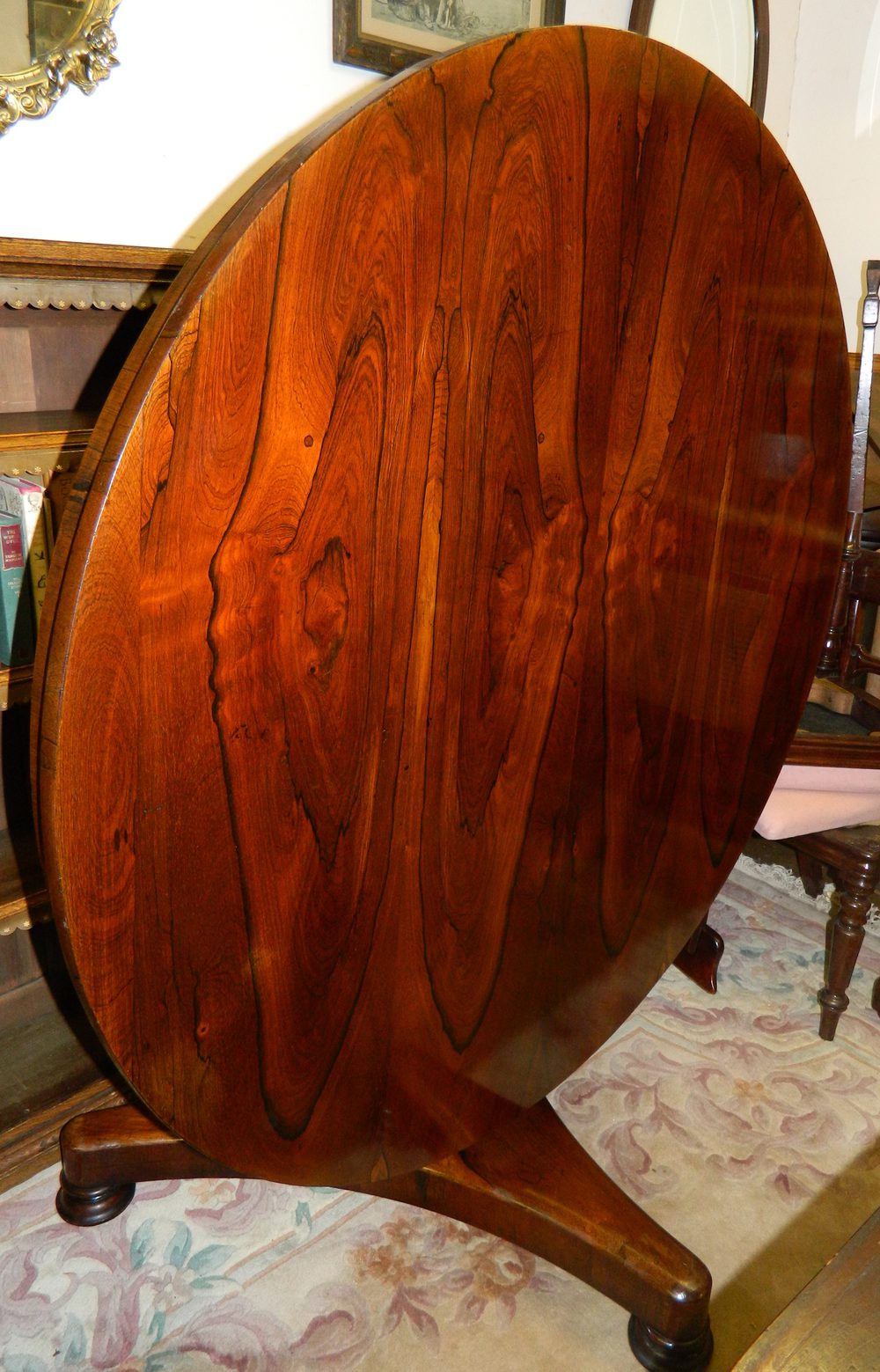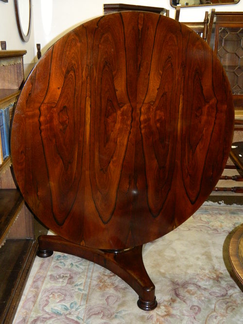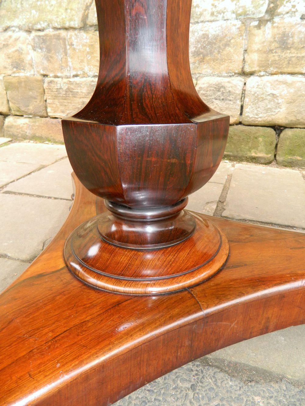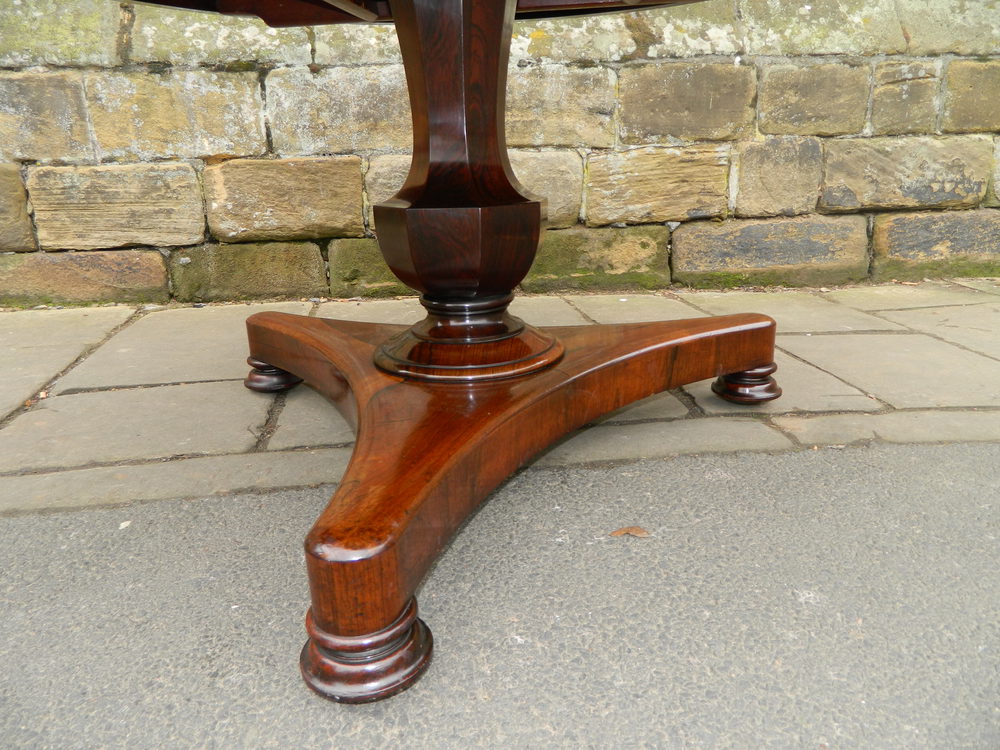fabulous rosewood breakfast table with the most beautifully figured tilt top, octagonal faceted support and triform base fitted with brass castors.