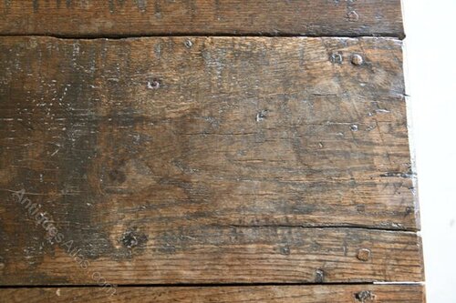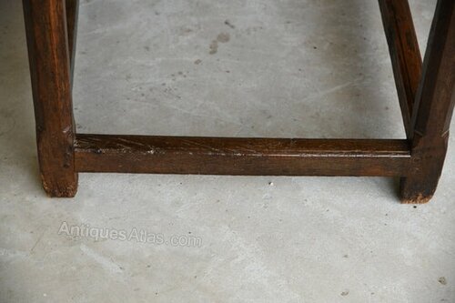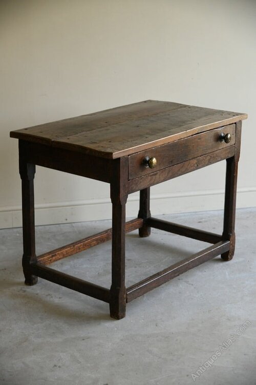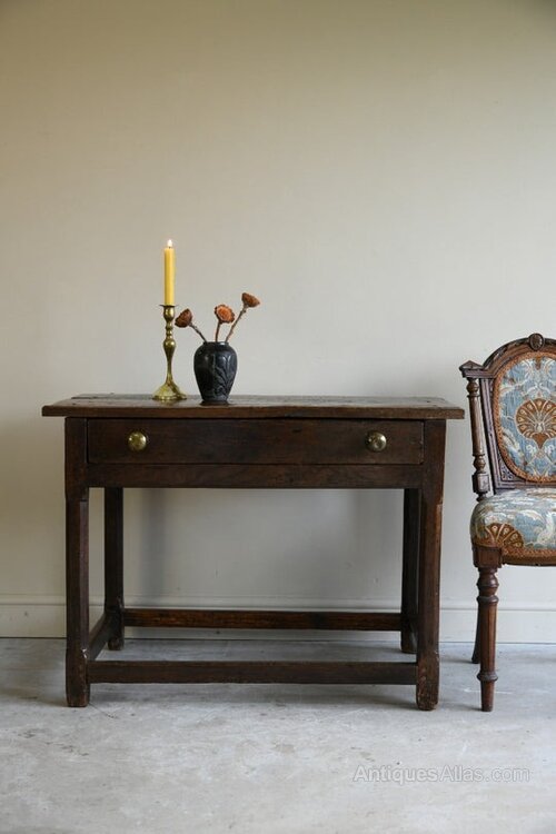 Condition: Solid condition, age and wear, gaps between the boards on the drawer, later brass handles, evidence of historic woodworm and rot around the bottom of the legs - please refer to the photos, later stretcher.