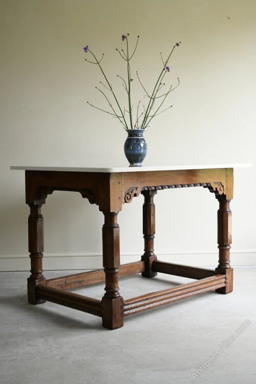 Oak & Quartz Table. Antique 18th Century style oak table base with later polished quartz table top