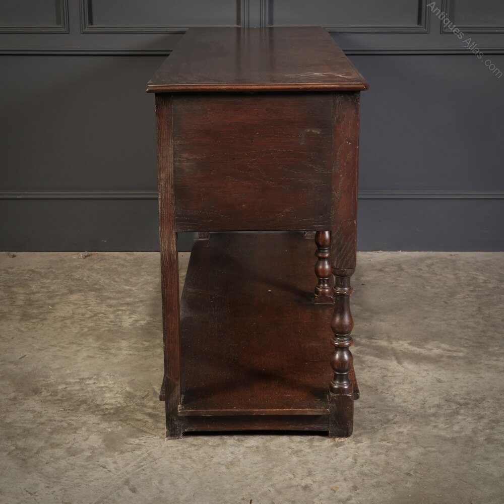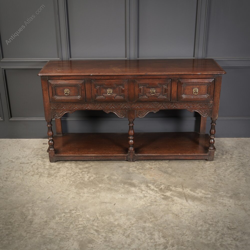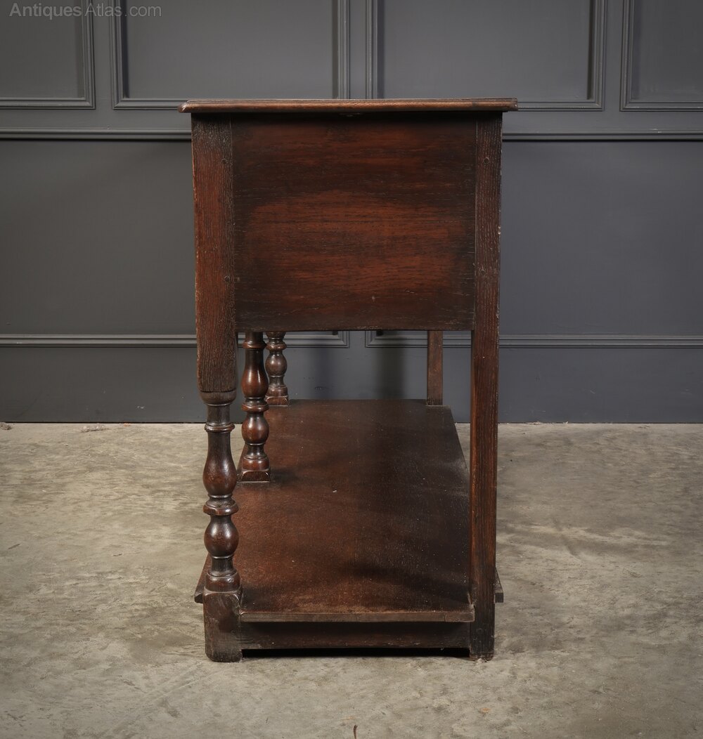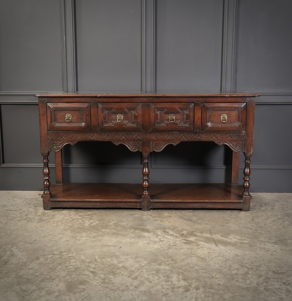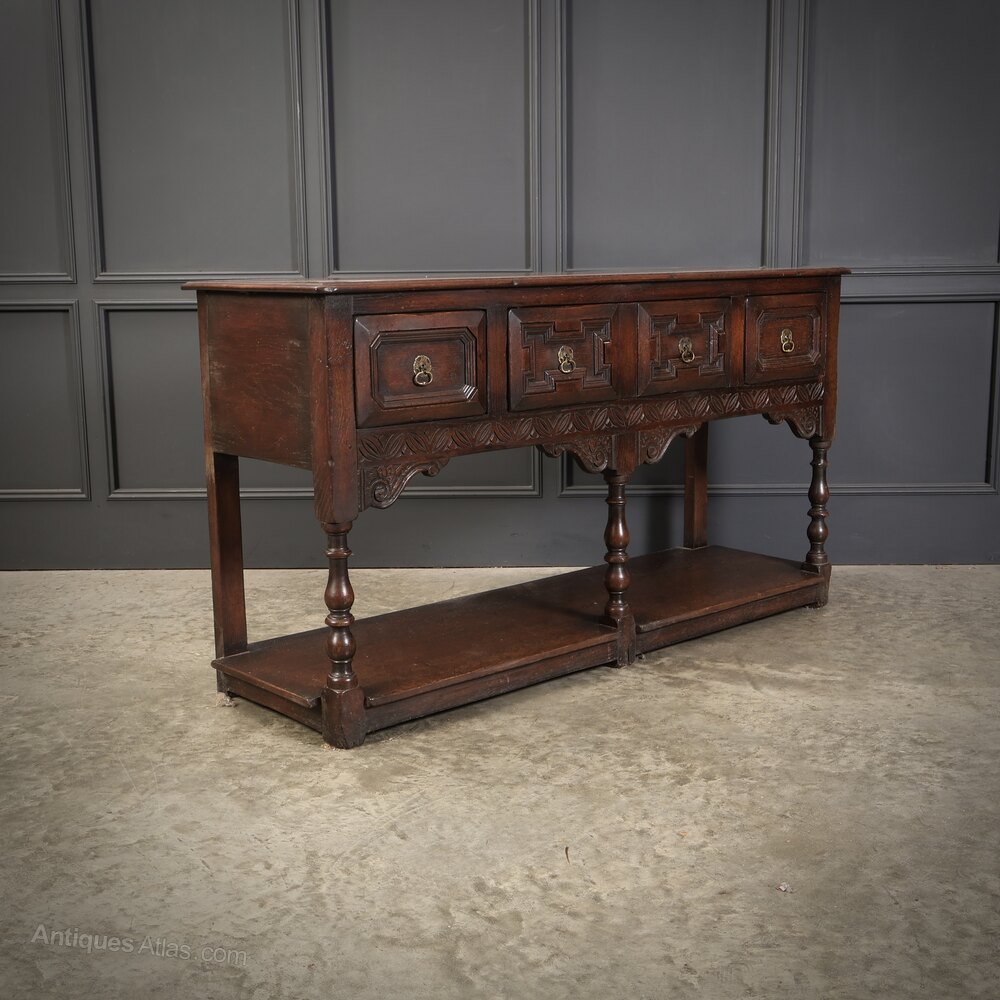 The lower frieze is adorned with carved decorative detail, this leads down to the open potboard base, ideal for displaying kitchenware, baskets, or decorative items. The potboard is supported by turned front baluster legs and plain square rear supports, ensuring stability and durability.