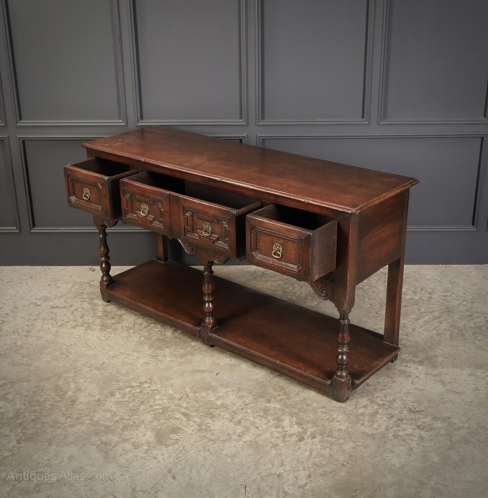 The dresser features a solid oak top above three carved drawers—each framed with simple yet elegant geometric mouldings—and fitted with solid brass drop handles.