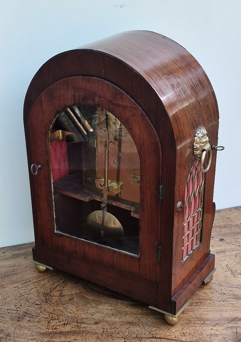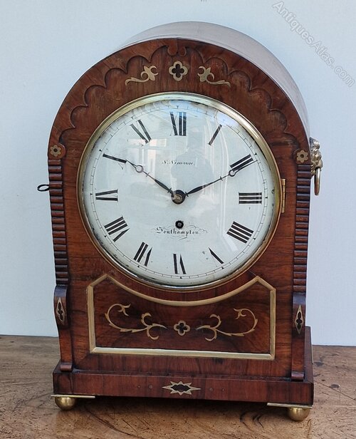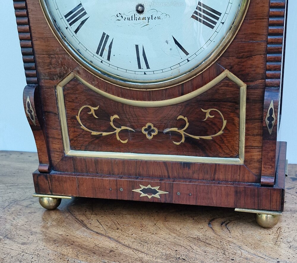 An English William IV period fusee bracket/table clock. A well detailed mahogany case with choice flame veneers. An arched top with brass inlays. A recessed base panel with brass edging. Brass fretted side panels with silk backing. Lions head side brass cast handles. A cast brass bezel with convex glass and standing on brass ball feet. An arched glass back door. A convex dial with 'moon' blued steel hands signed 'S Simson, Southampton'.
