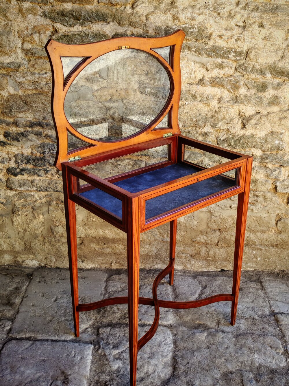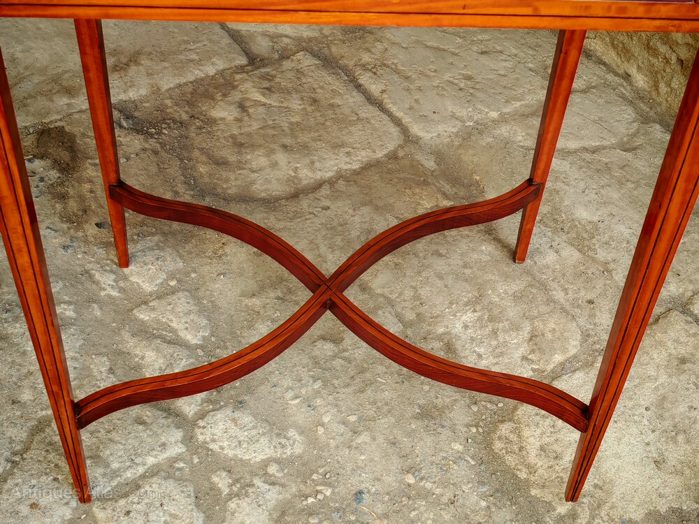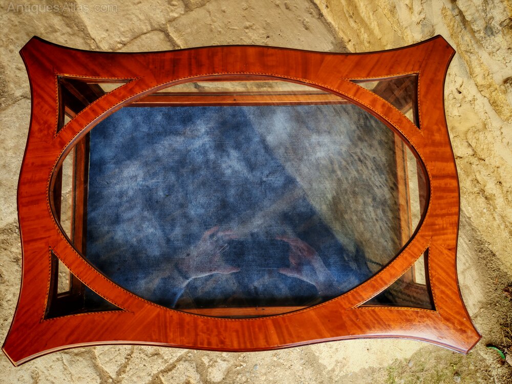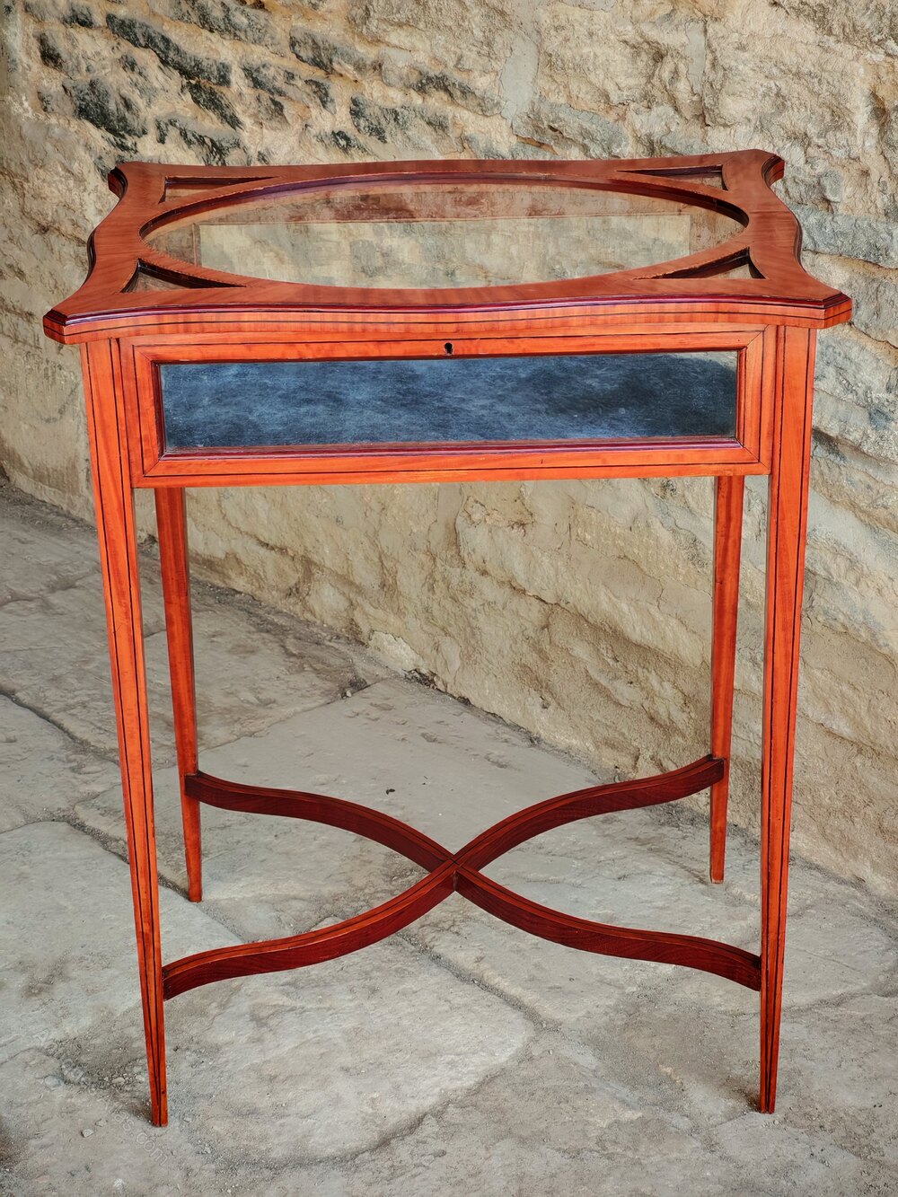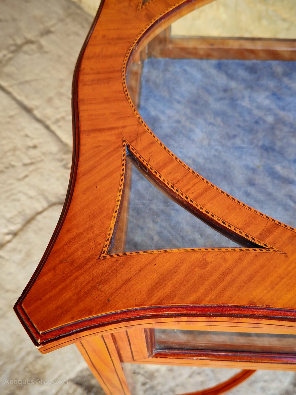 A superb satinwood bijouterie circa 1880. The serpentine shaped top has ebony and boxwood stringing around the glass. The tapering legs have ebony stringing and are joined by curved stretchers which also have ebony stringing.