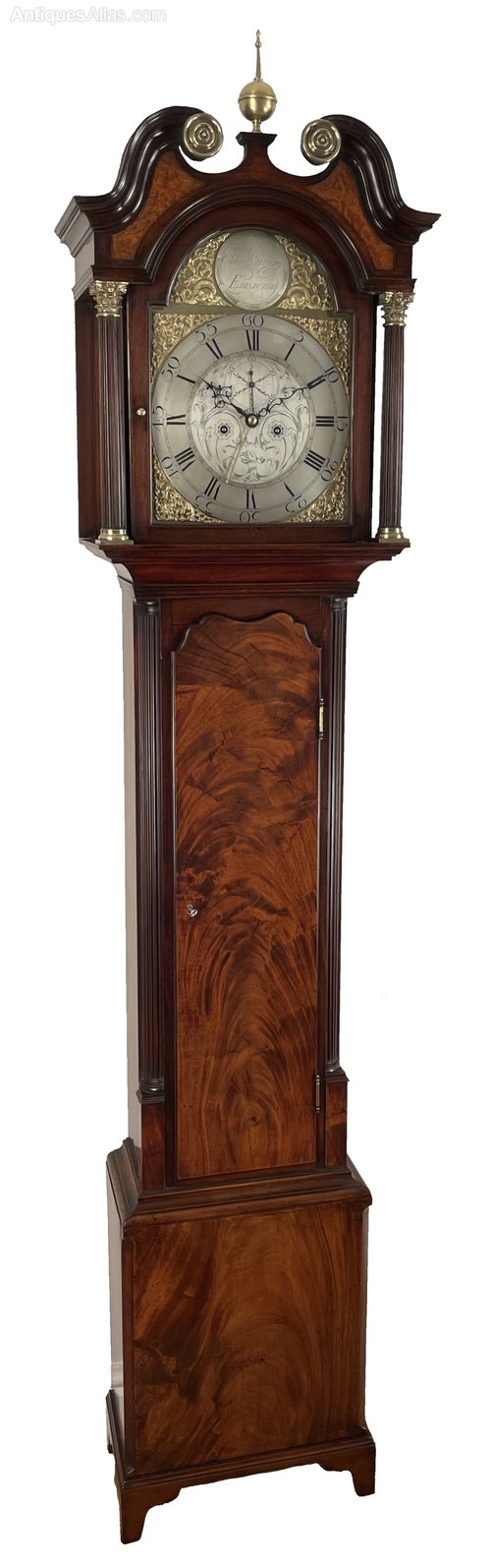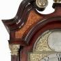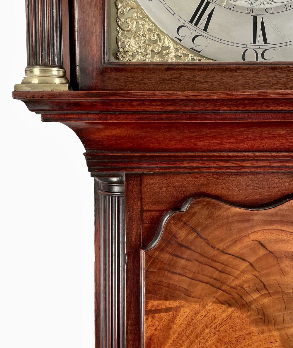 The exceptional cabinet work displays a superb flame veneered trunk door of exquisite colour. This is flanked by reeded quarter columns finishing with solid mahogany capitals. The base is similarly veneered with and standing on small bracket feet. The hood also displays reeded pillars terminating with brass Doric capitals to the base and elaborate Corinthian capitals to the top of each column. The typical swan neck pediment is finished with a central brass finial, brass paterea, unusual birds eye maple veneered blind sound frets and inspection windows to the sides.