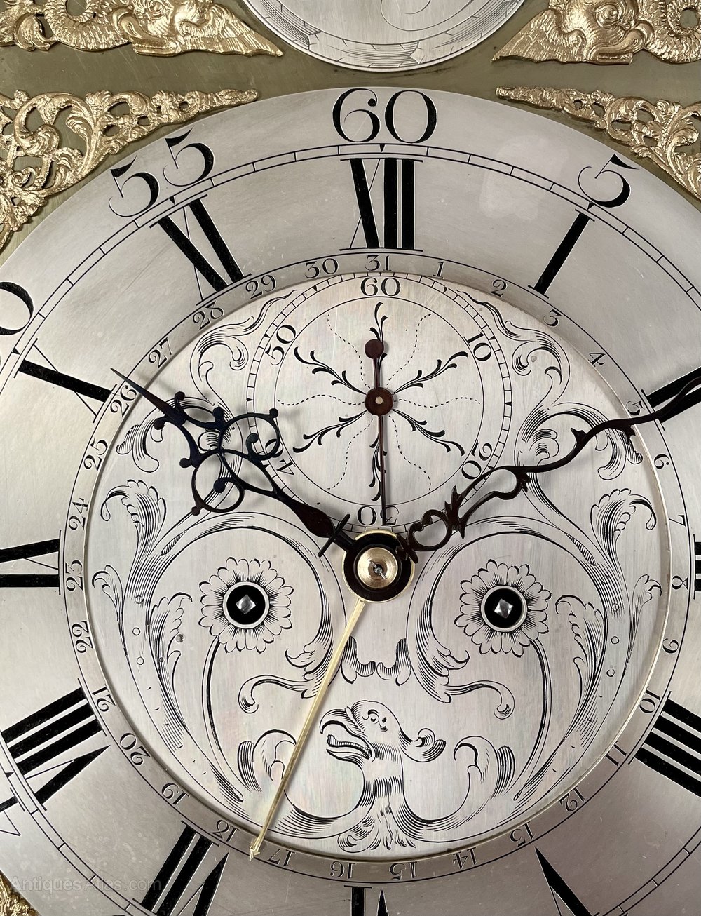 The movement is of 8 day duration and strikes the hours on a bell. The arched, silvered and brass dial has Roman numerals, Arabic minutes, seconds and a rare centre date feature. The makers name and place of work is engraved on a silvered brass cartouche to the arch of the dial and framed with finely chased brass spandrels depciting sea creatures. The centre of the dial with elaborate scrolls, foliage, flowers and a mythical Griffin above the number VI. Also with blued steel hands and a brass pointer displaying the date of the month. The corners are also decorated with applied spandrels.