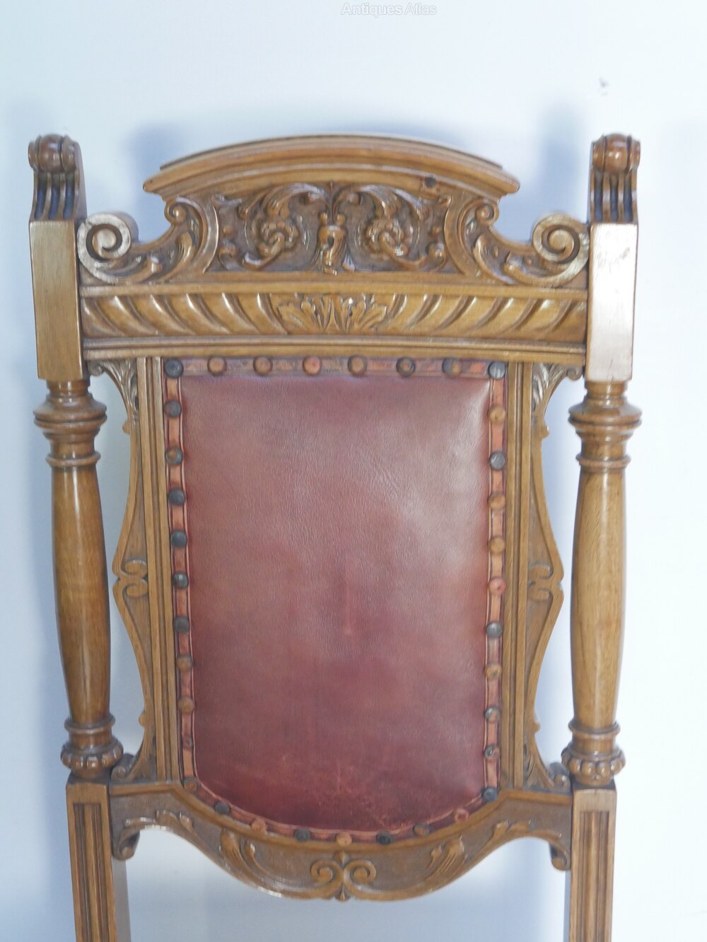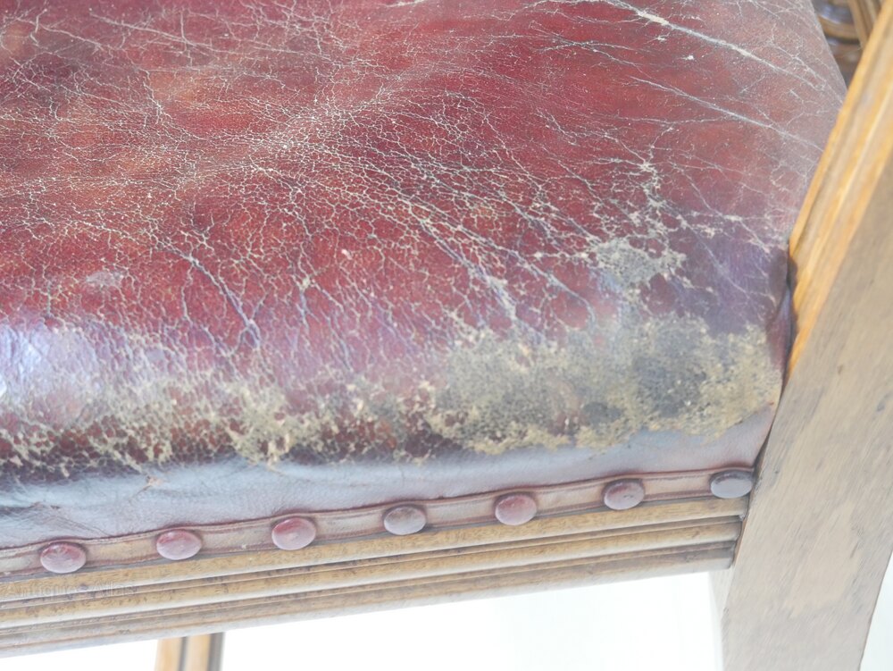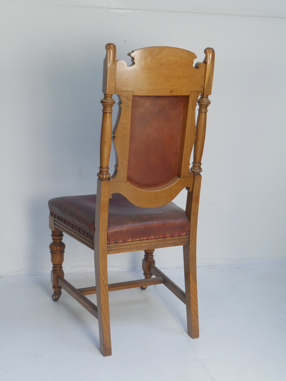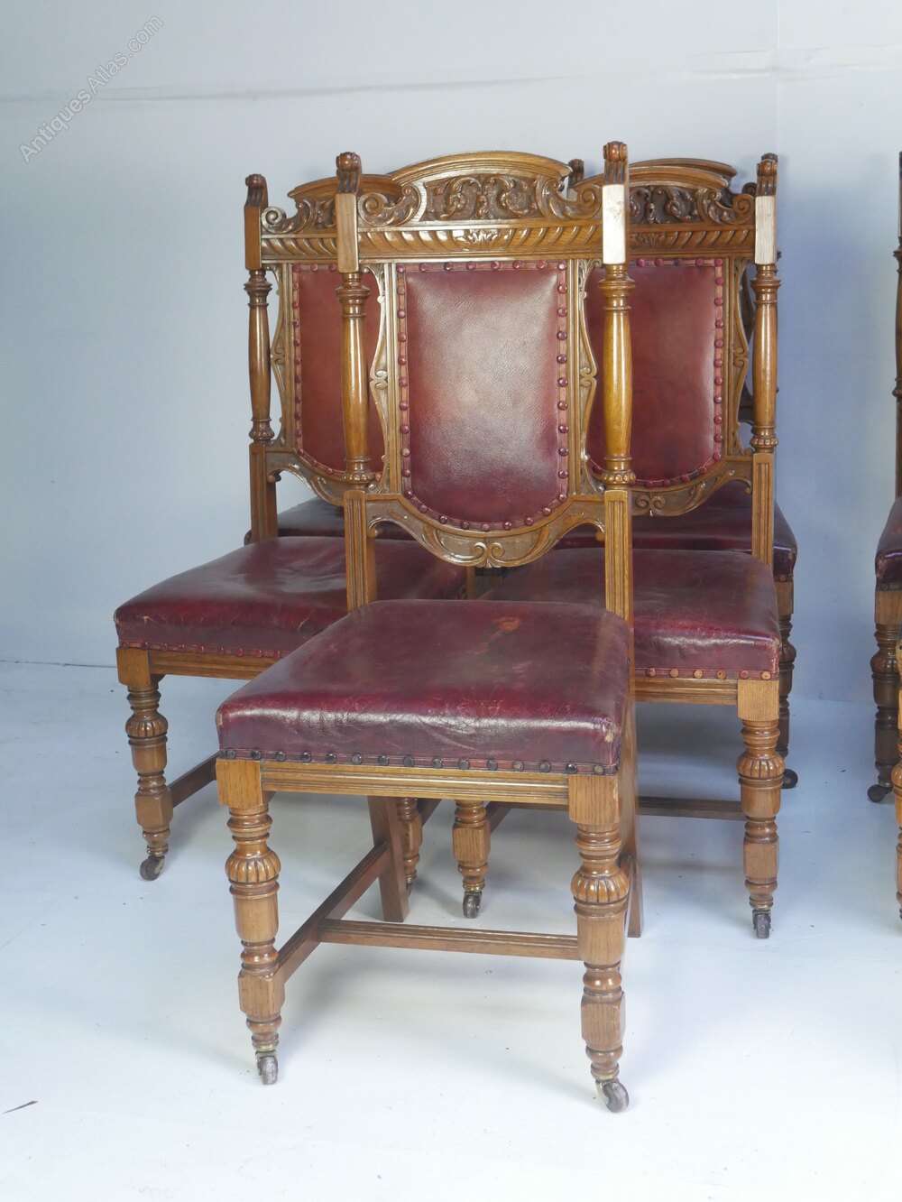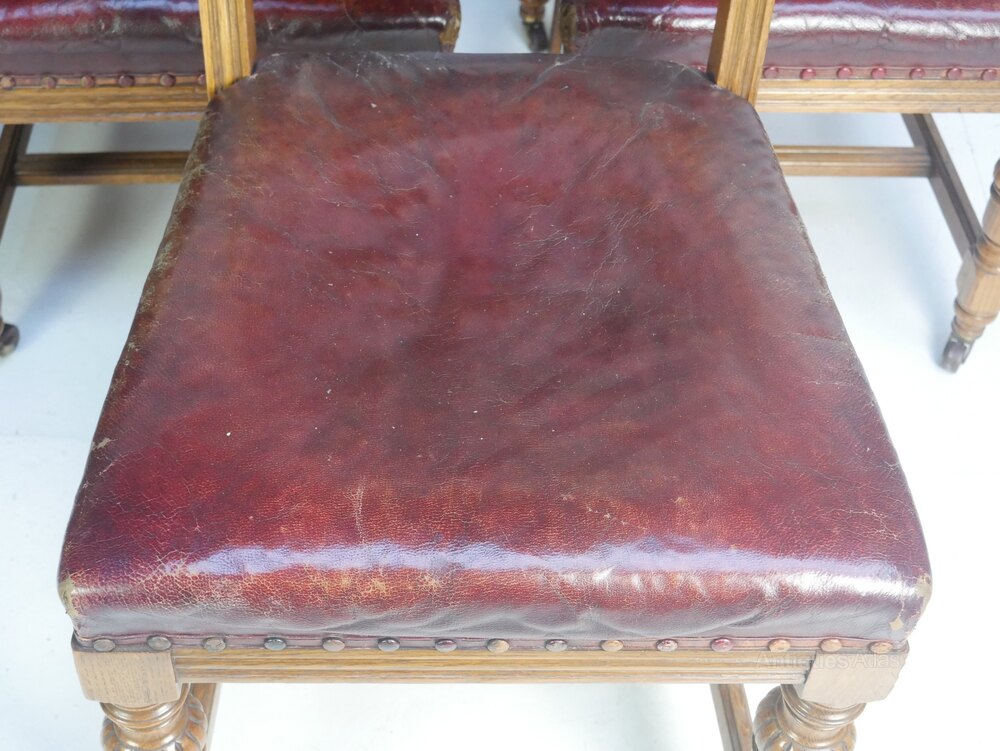 A very good quality set of 10 oak dining chairs with lovely original red leather upholstery. A comfortable sitting chair, with turned front legs and original castors. The two chairs for the ends of the table are 3cm taller with a seating height of 49cm, 8 chairs seating height 46cm all chairs in good strong antique condition, excellent wear to the leather, all ready for use. Some extra photos available.
