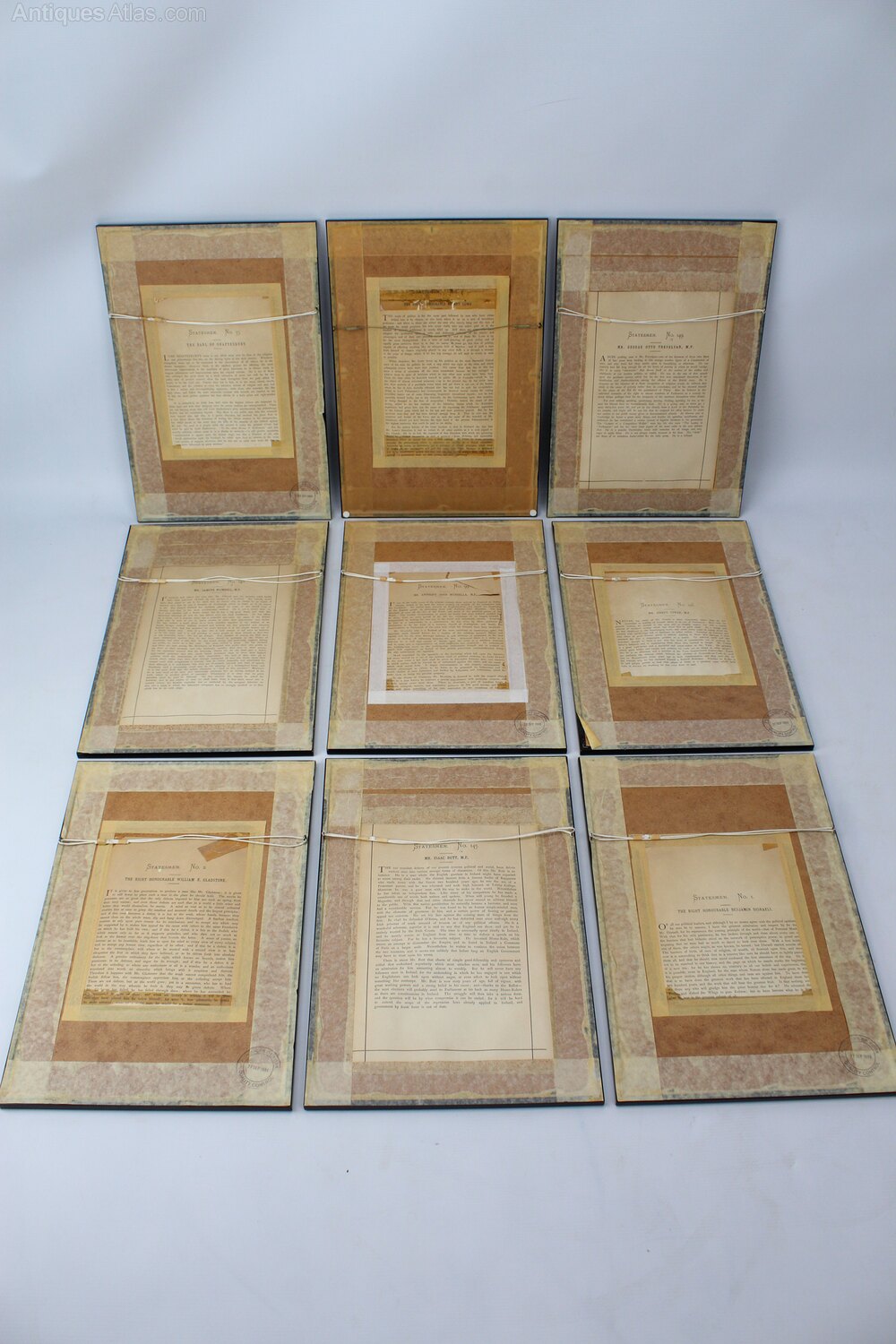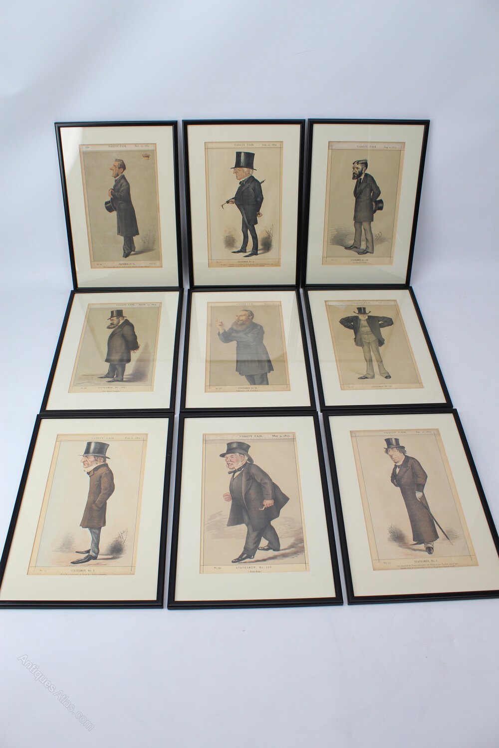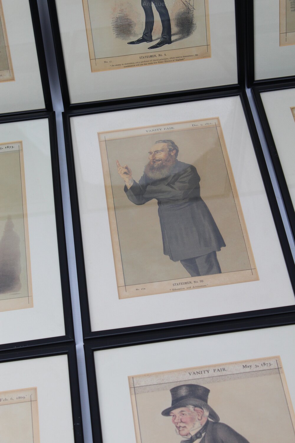A set of 9 antique Vanity Fair “Statesmen” framed prints mounted and glazed in glossy black frames, these antique prints are a good collection to bring a little satirical humour to your wall.