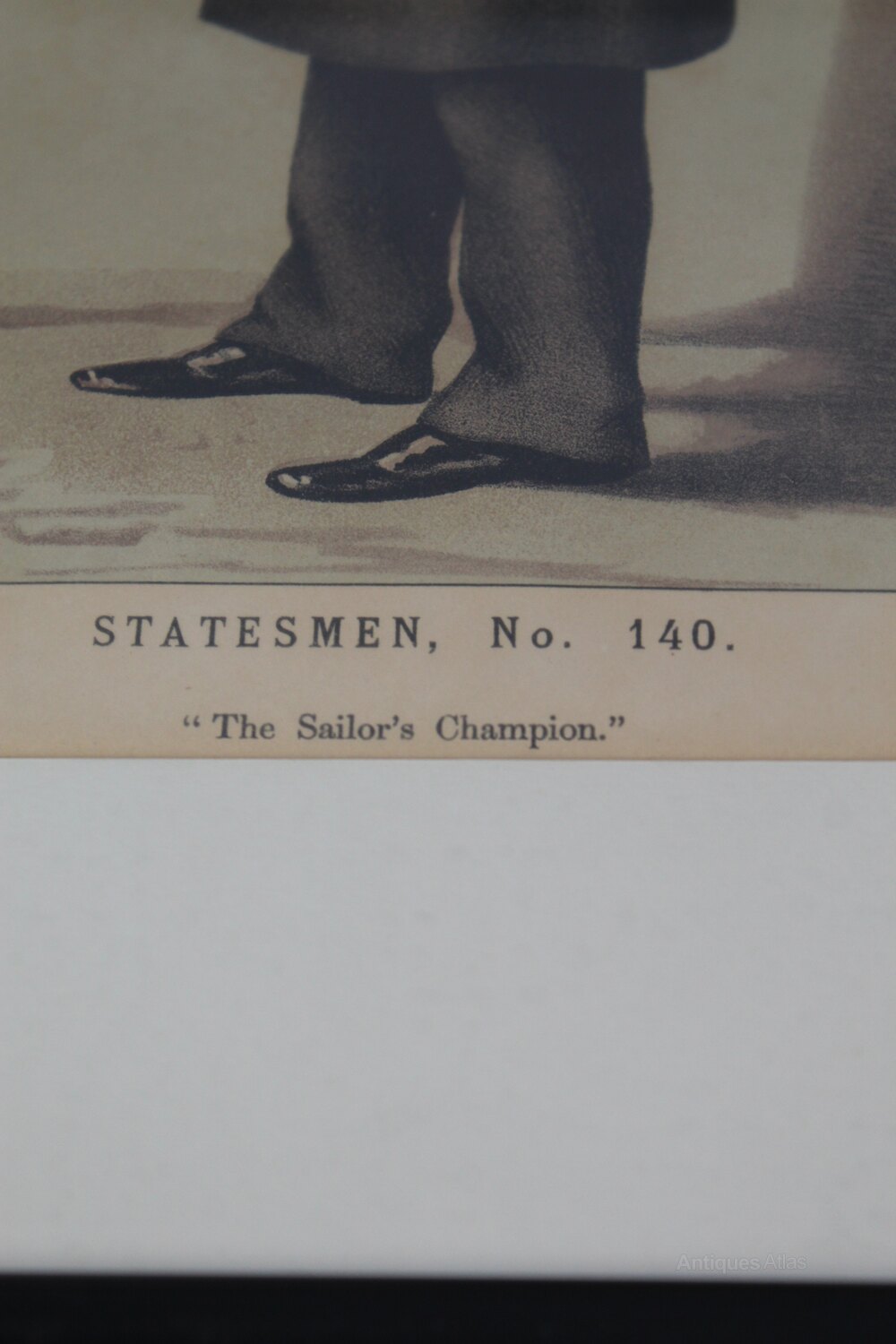 “Statesmen No.140”, A caricature portrait of Mr Samuel Plimsoll M.P. Originally published in Vanity Fair March 15th 1873. By artist W. Vine “WV”.