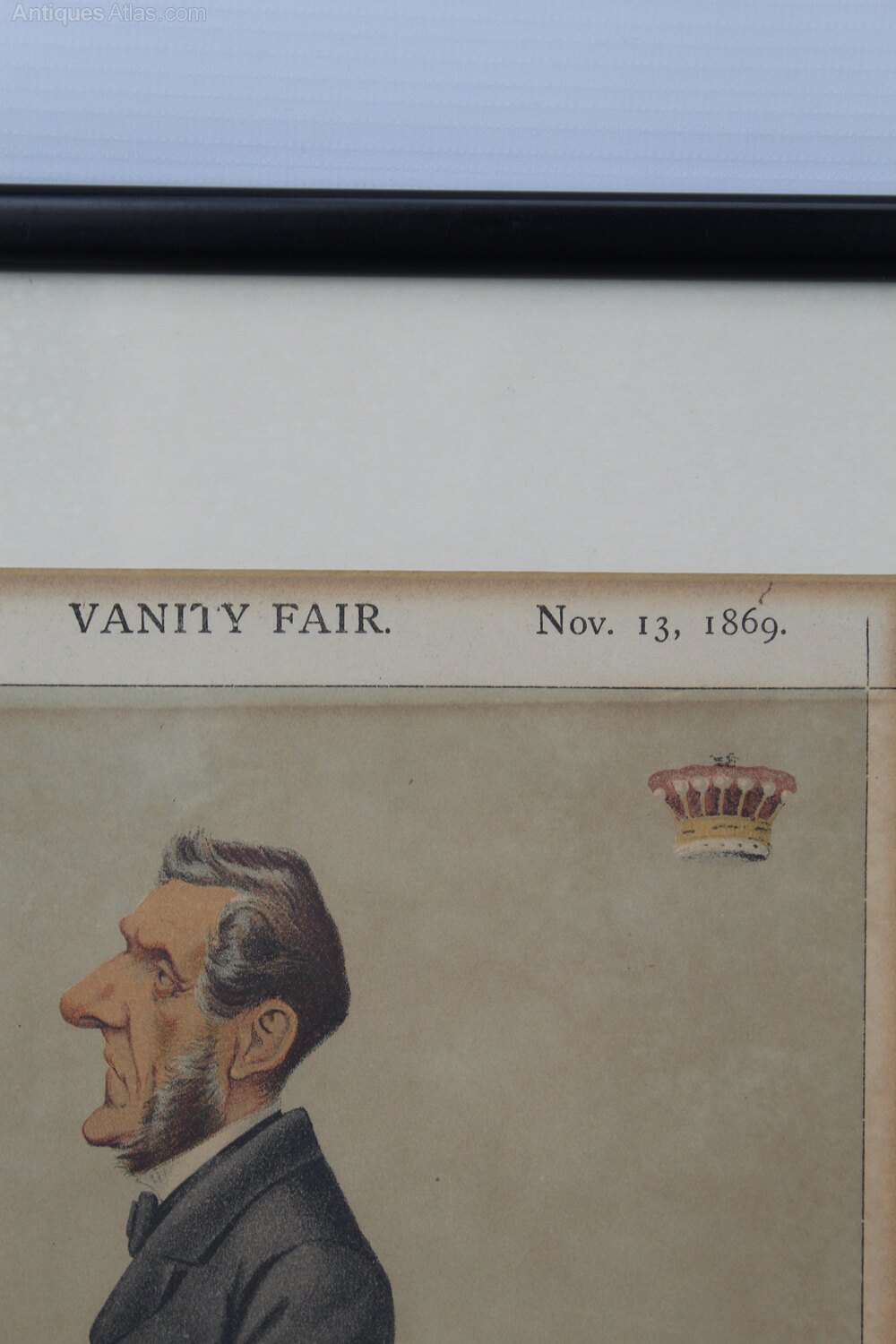Vanity Fair was a weekly magazine published in Britain from 1868 to 1914 and offered a satirical take on Victorian society, publishing articles on fashion, current events and the latest scandals. A full-page color lithograph caricature of a contemporary celebrity or dignitary appeared in most issues, and it is for these caricatures that Vanity Fair is best known today. The primary artists were Carlo Pellegrini “Ape” and Leslie Ward “Spy”, and it is because of the latter artist as to why these prints are often collectively referred to as “Spy Prints”.