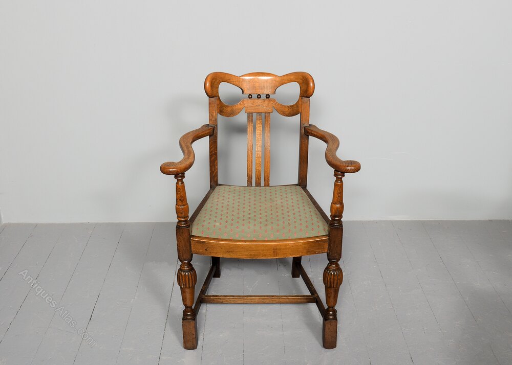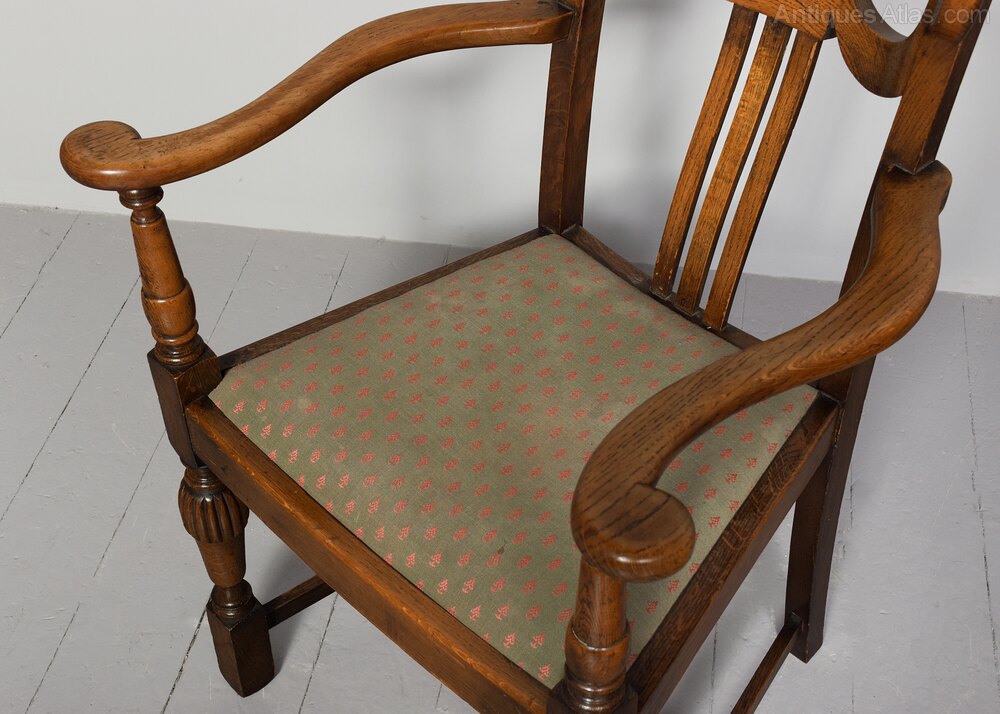 Circa 1920s. A quality set of 6 solid oak dining chairs, consisting of four side chairs and two arm chairs, each with a shaped curved top rail with shaped uprights, the curvaceous arms supported on elegant uprights, drop-in seat pads and solid seat rails, with square and slightly out-swept back legs, turned fluted and tapering front legs, braced by conforming stretchers.