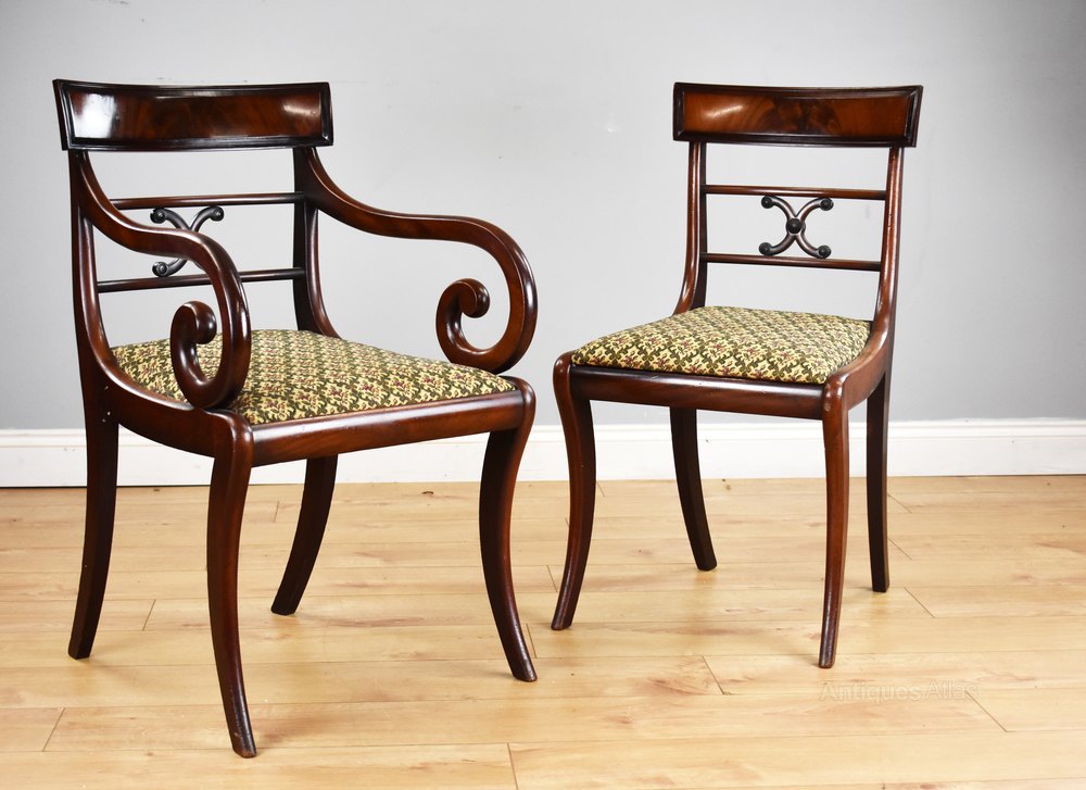 For sale is a good quality set of 8 Regency style mahogany dining chairs consisting of two carvers and six singles, each with flame mahogany backs, above drop in seats standing on elegant sabre legs. All of the chairs are structurally sound and in good condition, showing minor signs of wear commensurate with age and use.