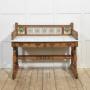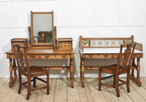 Oak washstand, the raised gallery with inset tiles by Maw and Co, to the rectangular marble top above two long freeze drawers with stylised brass handles. All raised on four turned supports united by stretchers terminating in castors.