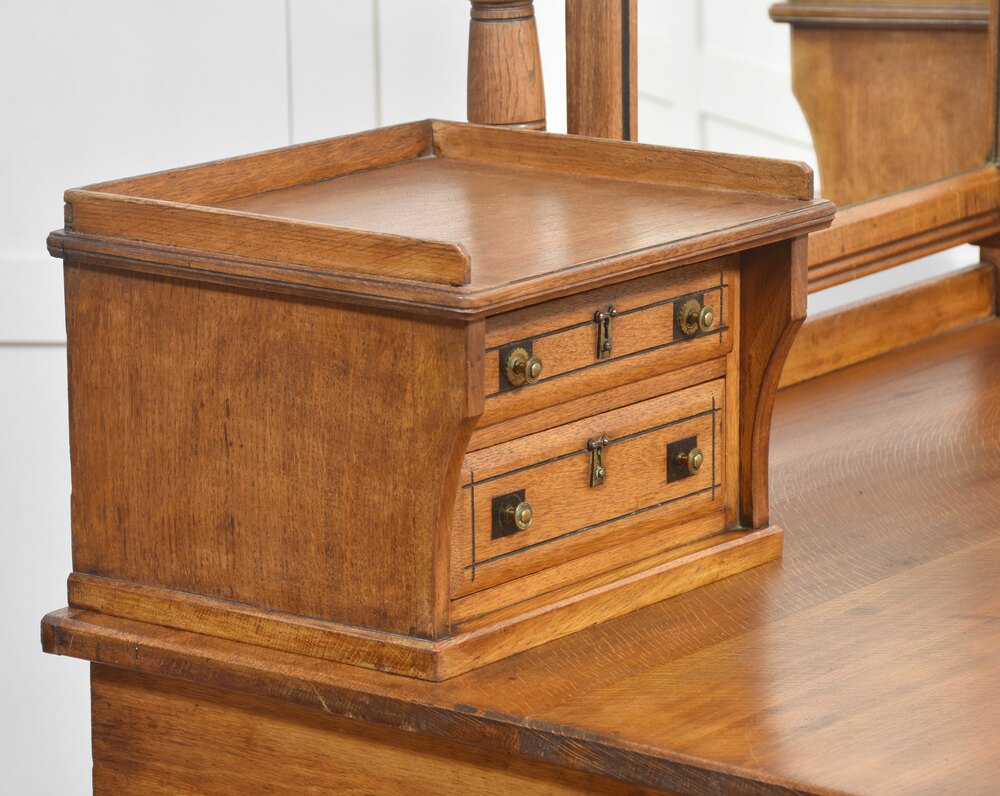 Oak dressing table, the central adjustable mirror supported on architectural supports above two banks of drawers. To the rectangular top above two long freeze drawers with stylised brass handles. All raised on four turned supports united by stretchers terminating in castors.