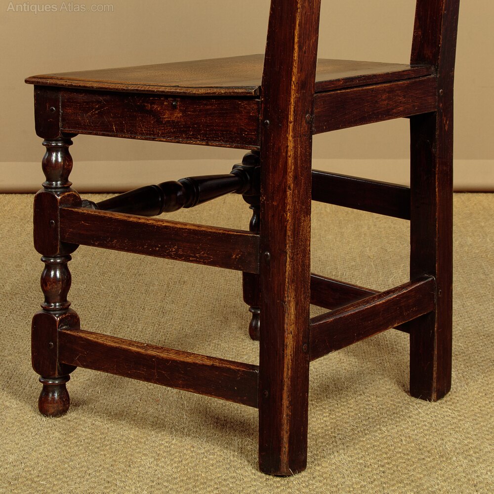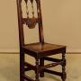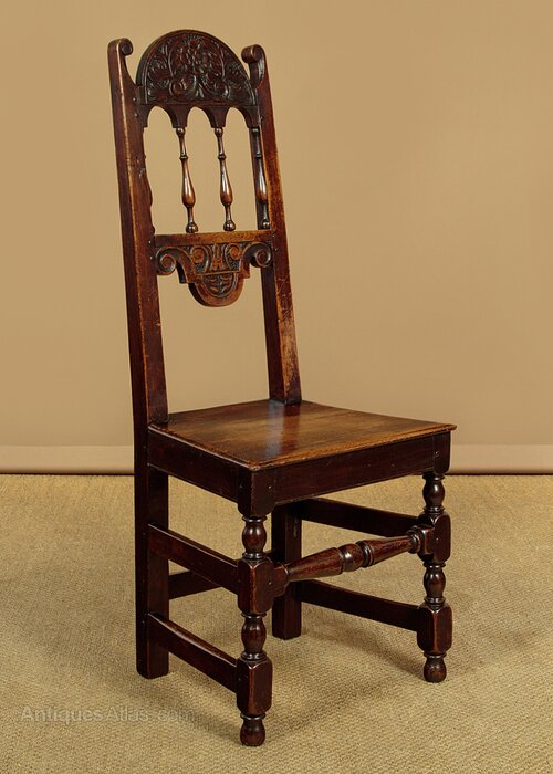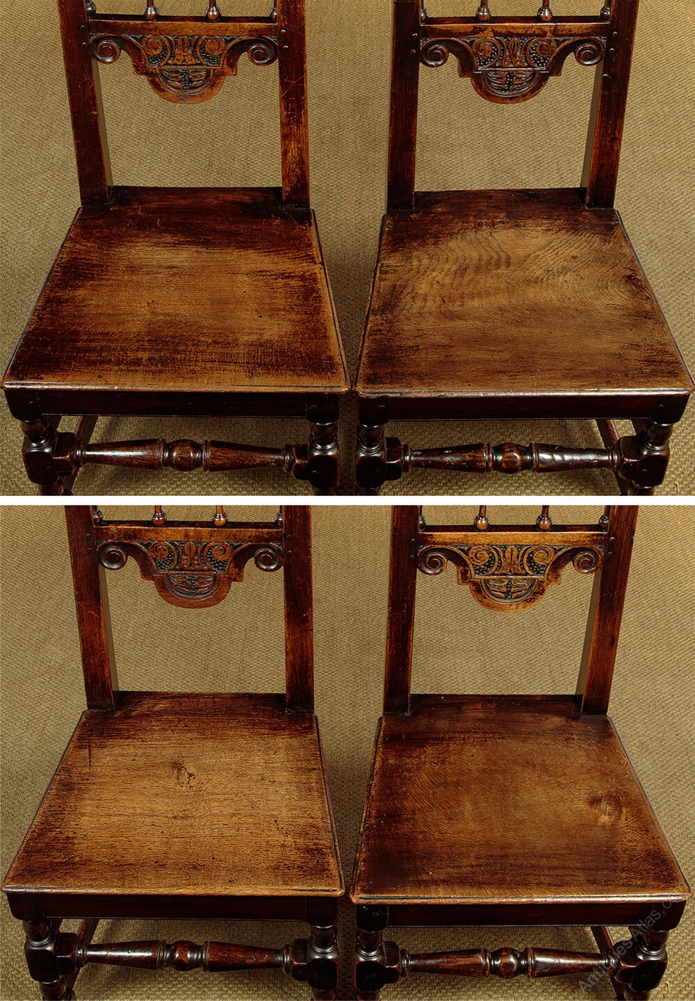 Good set of four 17th.c. style oak dining chairs c.1920. Good quality facsimiles of chairs or 'joined backstools' of the type produced in South Yorkshire in the latter half of the 17th century. Tall decorative backrests with an arched top carved with flowers and foliage over three arches supported on slim turned spindles with a good carved stretcher below. Between slightly tapering rear stiles topped with distinctive scrolling finials. Single piece board seats with a moulded edge (seat height 18½"). Turned and block front legs and a turned and tapering front stretcher. Straight stretchers to the sides and rear. Excellent colour and condition, cleaned and waxed in our workshops.