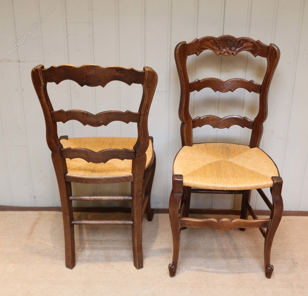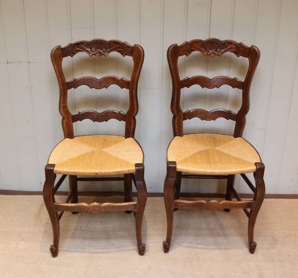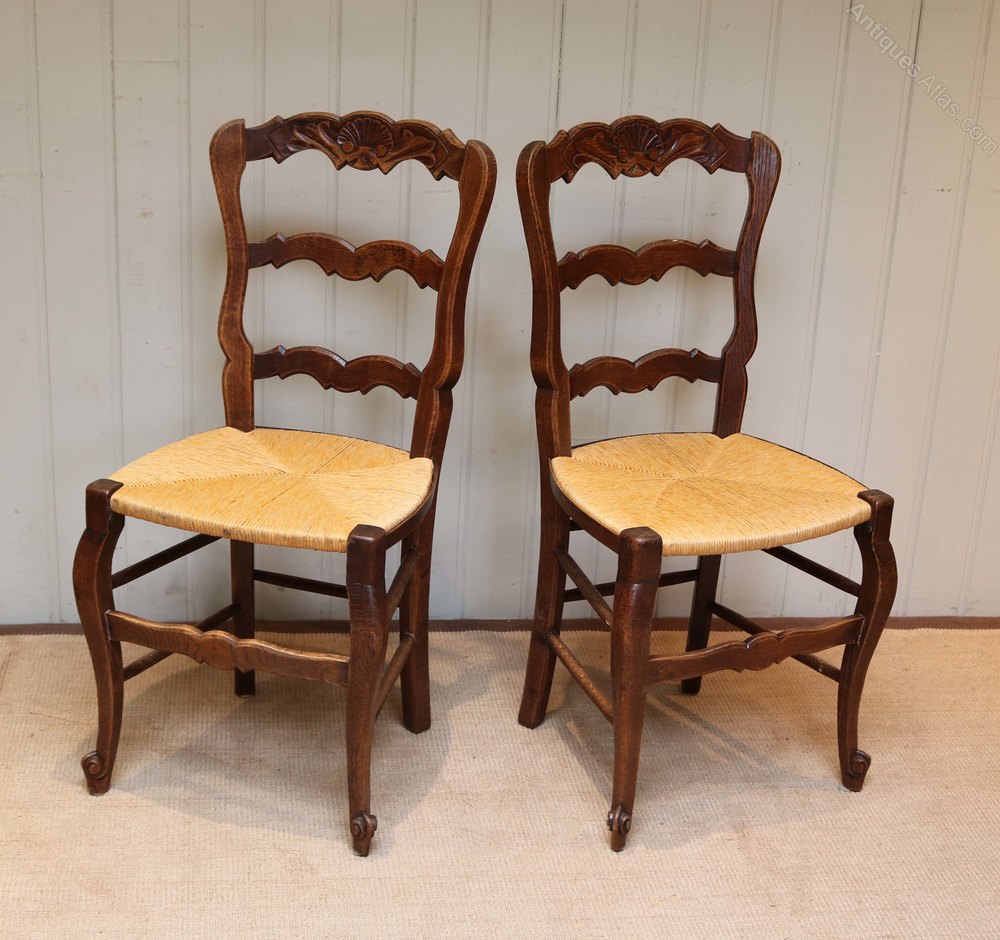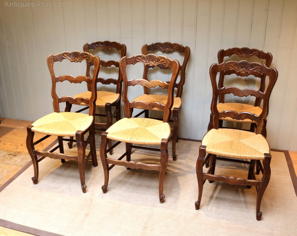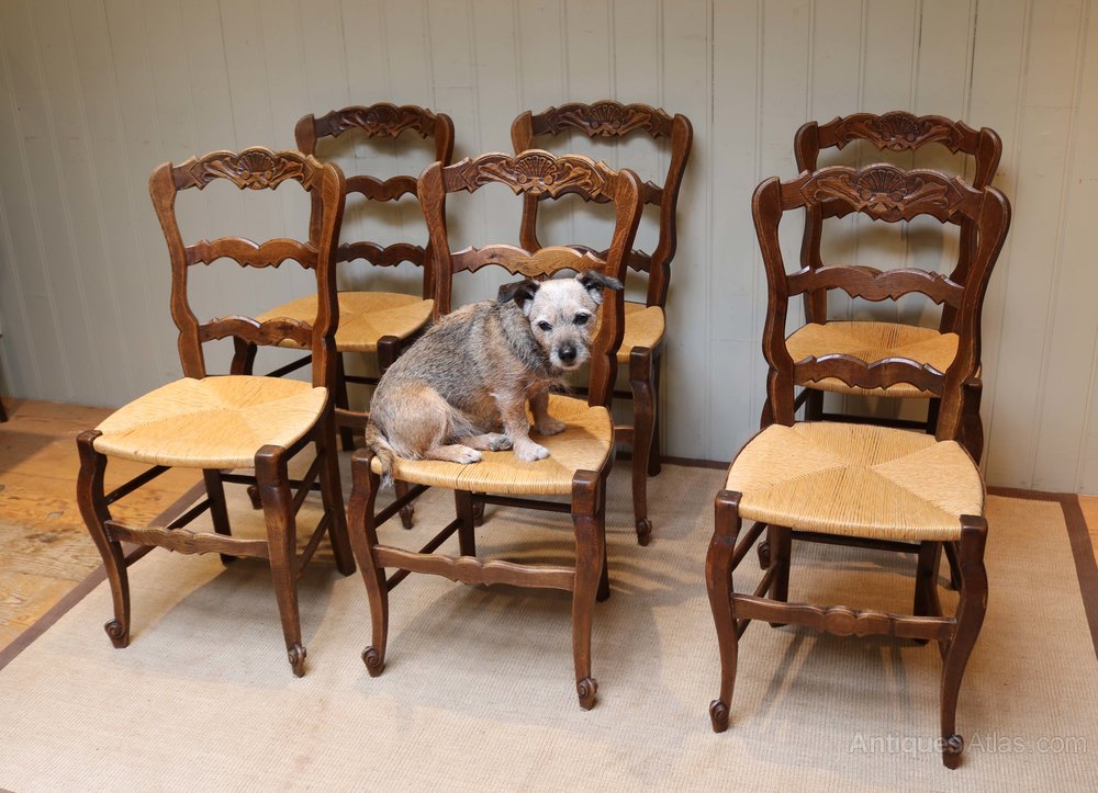 Set of six French oak dining chairs having ladder backs with a carved top rail having fixed rush seats raised on cabriole legs