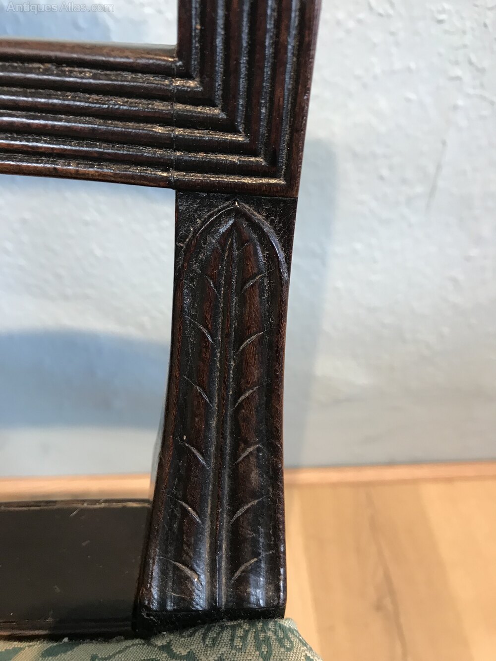 Handsome and unusual set of six matching, 18th-century Sheraton period, stained Elm, dining chairs. The chairs all feature ornate, carved backs, square tapered front legs, joint with a lower H rail, -which gives additional strength- and a unique scroll top cresting rail. The chairs are in excellent condition, all the joints are firm and the attractive upholstery is in good condition with minor marks. The seat height is 47 cm.
