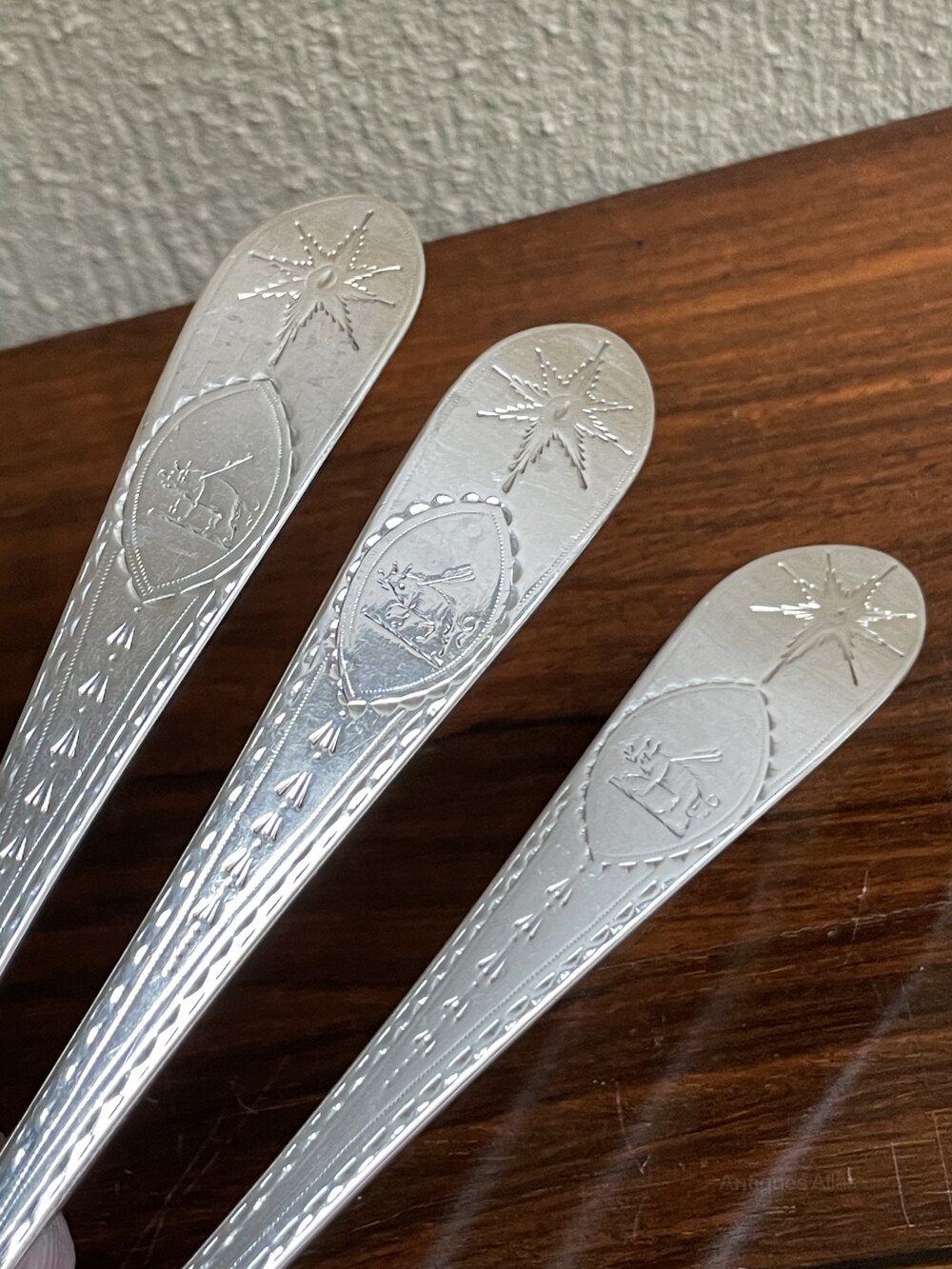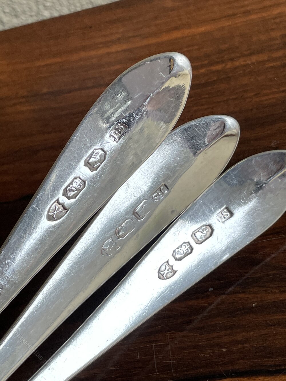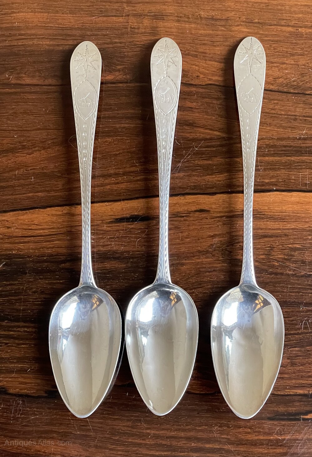 A good set of three George III solid silver serving spoons with fine bright cut decoration and crest. Fully hallmarked for Dublin 1794 by John Shiels.