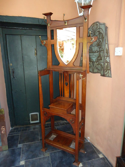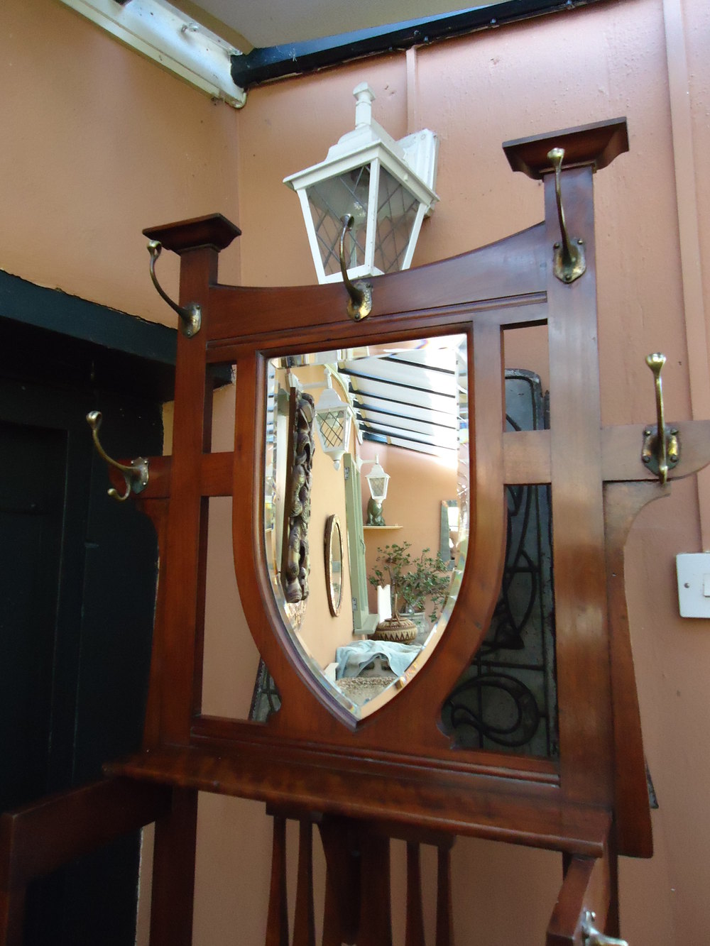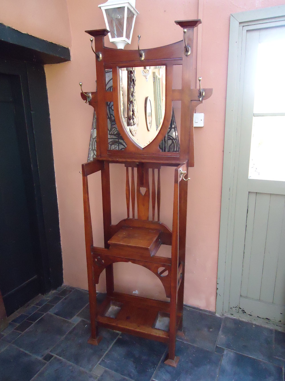 Pretty Walnut Shapland & Petter Hall Stand with shield shaped bevelled mirror and lovely pierced yin-yang and heart detail. A very stylish item which has been well used.
